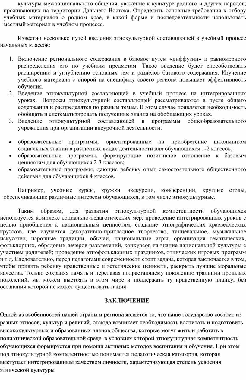 При формировании приоритетов этнокультурной составляющей в содержании образования следует учесть: разнообразие национального состава, языковой ситуации, традиций, обычаев, культурных особенностей характерных для нашей республики; актуальность воспитания культуры межнационального общения, уважение к культуре родного и других народов, проживающих на территории Дальнего Востока. Определить основные требования к отбору учебных материалов о родном крае, в какой форме и последовательности использовать местный материал в учебном процессе.