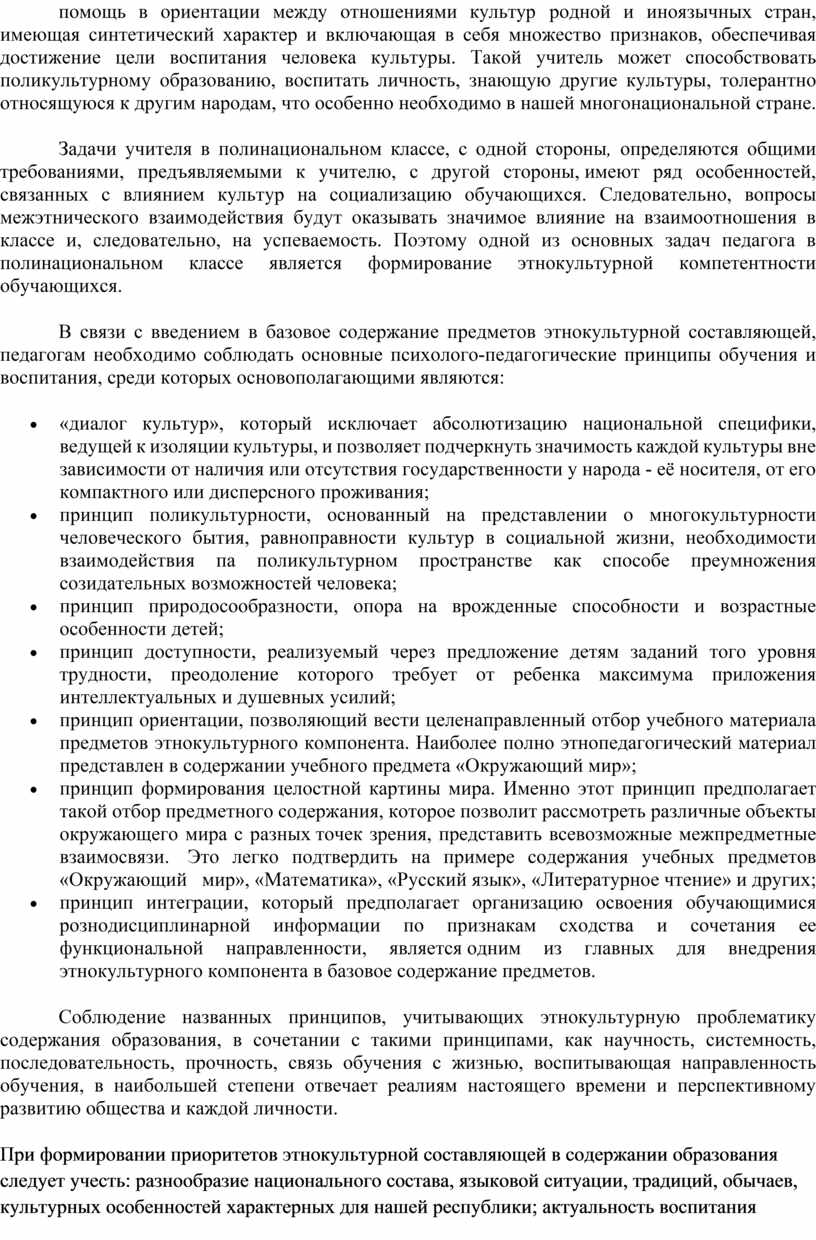 В связи с введением в базовое содержание предметов этнокультурной составляющей, педагогам необходимо соблюдать основные психолого-педагогические принципы обучения и воспитания, среди которых основополагающими являются: