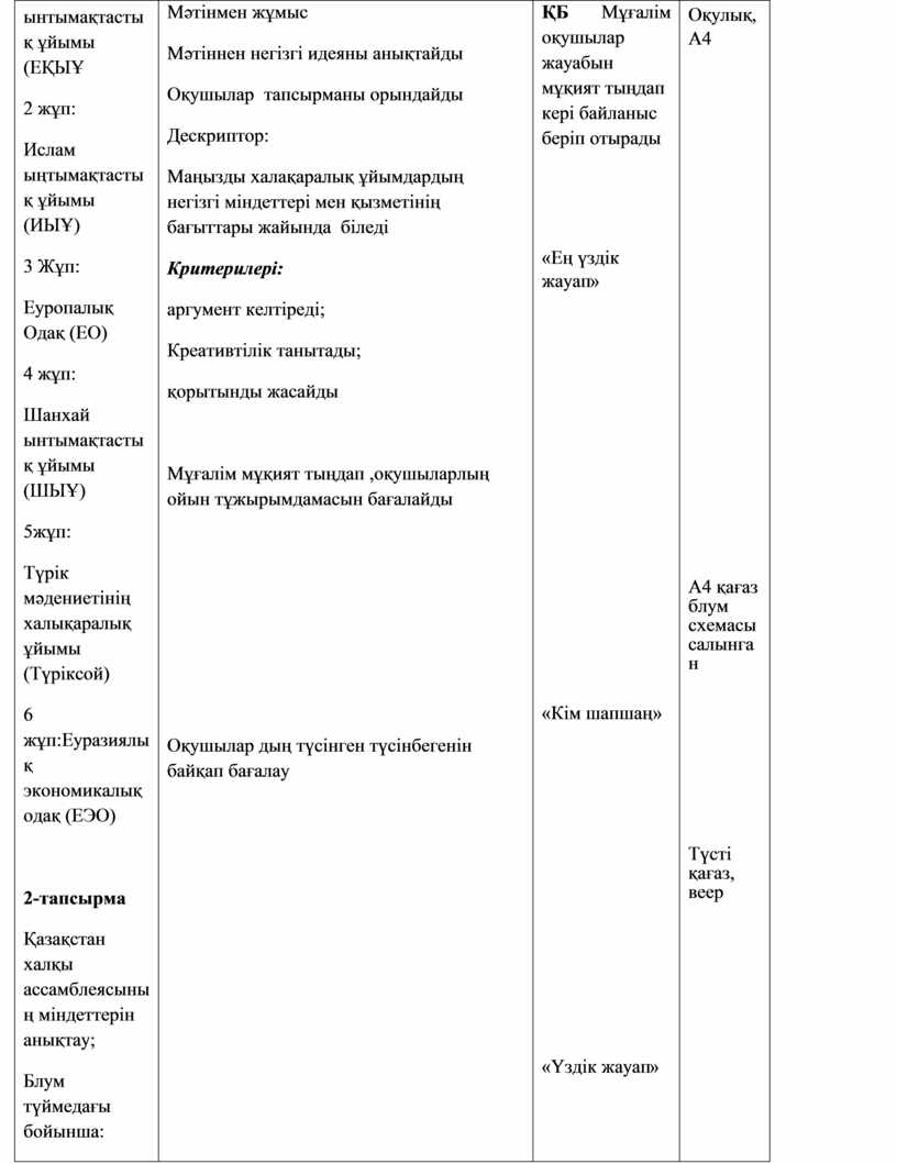 Мәтінмен жұмыс Мәтіннен негізгі идеяны анықтайды Оқушылар тапсырманы орындайды Дескриптор: Маңызды халақаралық ұйымдардың негізгі міндеттері мен қызметінің бағыттары жайында біледі Критерилері: аргумент келтіреді; Креативтілік танытады; қорытынды жасайды