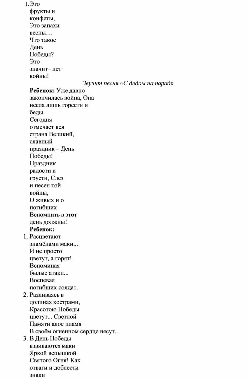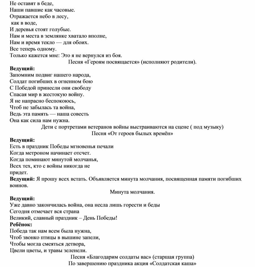 Ведущий: Дорогие ребята! Дорогие гости! Много лет прошло с того дня, как наша Армия и наш народ победили фашистскую Германию. Каждый год мы отмечаем этот великий праздник.