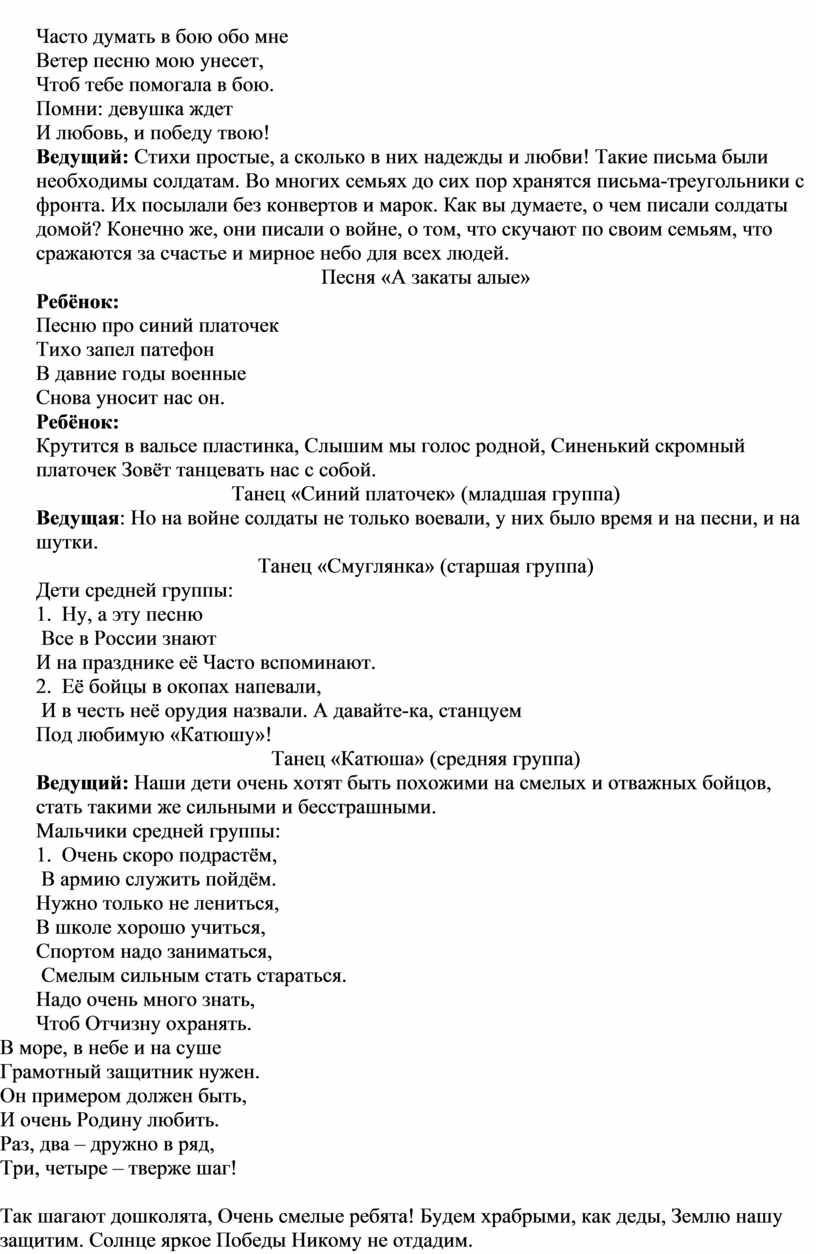 Ведущий: Стихи простые, а сколько в них надежды и любви! Такие письма были необходимы солдатам. Во многих семьях до сих пор хранятся письма-треугольники с фронта. Их посылали без конвертов и марок. Как вы думаете, о чем писали солдаты домой? Конечно же, они писали о войне, о том, что скучают по своим семьям, что сражаются за счастье и мирное небо для всех людей.