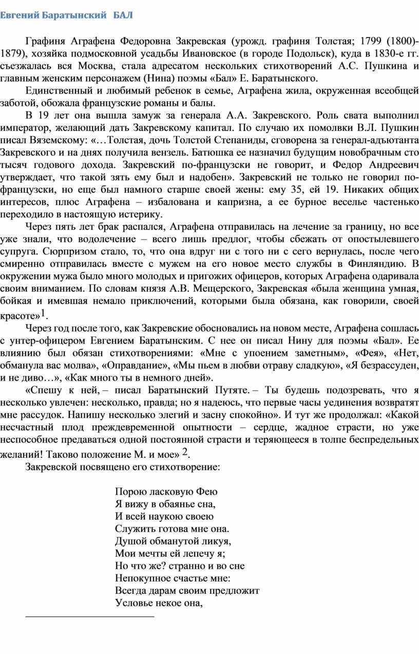 Графиня Аграфена Федоровна Закревская (урожд. графиня Толстая; 1799 (1800)-1879), хозяйка подмосковной усадьбы Ивановское (в городе Подольск), куда в 1830-е гг. съезжалась вся Москва, стала адресатом нескольких стихотворений А.С. Пушкина и главным женским персонажем (Нина) поэмы «Бал» Е. Баратынского.