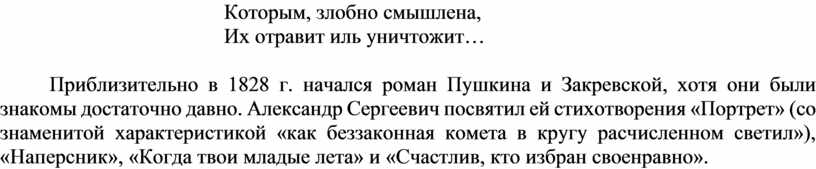 Приблизительно в 1828 г. начался роман Пушкина и Закревской, хотя они были знакомы достаточно давно. Александр Сергеевич посвятил ей стихотворения «Портрет» (со знаменитой характеристикой «как беззаконная комета в кругу расчисленном светил»), «Наперсник», «Когда твои младые лета» и «Счастлив, кто избран своенравно».