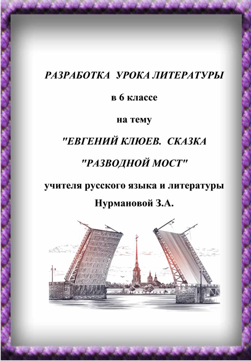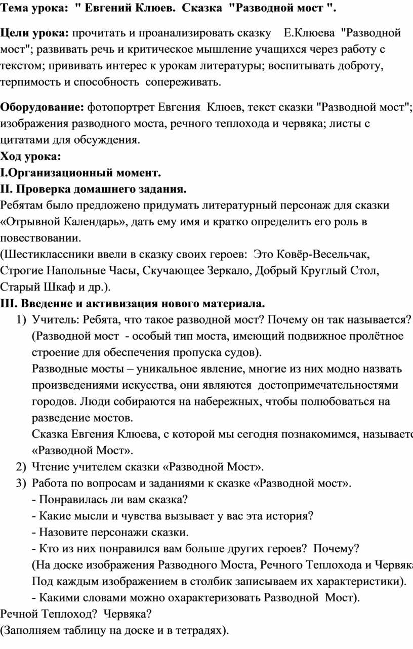 Цели урока: прочитать и проанализировать сказку Е.Клюева "Разводной мост"; развивать речь и критическое мышление учащихся через работу с текстом; прививать интерес к урокам литературы; воспитывать доброту, терпимость и способность сопереживать.