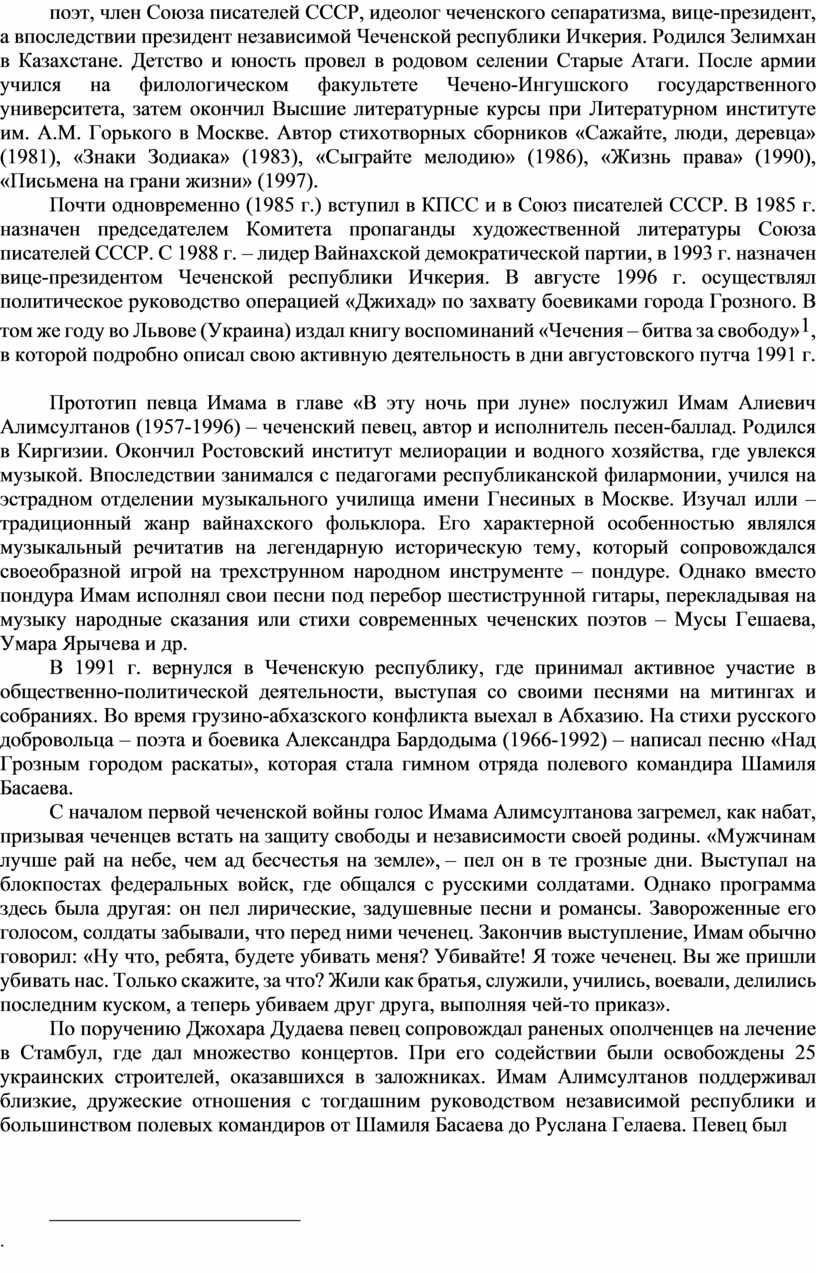 Прототип певца Имама в главе «В эту ночь при луне» послужил Имам Алиевич Алимсултанов (1957-1996) – чеченский певец, автор и исполнитель песен-баллад. Родился в Киргизии. Окончил Ростовский институт мелиорации и водного хозяйства, где увлекся музыкой. Впоследствии занимался с педагогами республиканской филармонии, учился на эстрадном отделении музыкального училища имени Гнесиных в Москве. Изучал илли – традиционный жанр вайнахского фольклора. Его характерной особенностью являлся музыкальный речитатив на легендарную историческую тему, который сопровождался своеобразной игрой на трехструнном народном инструменте – пондуре. Однако вместо пондура Имам исполнял свои песни под перебор шестиструнной гитары, перекладывая на музыку народные сказания или стихи современных чеченских поэтов – Мусы Гешаева, Умара Ярычева и др.