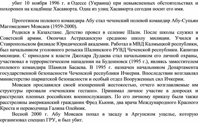 Прототипом полевого командира Абу стал чеченский полевой командир Абу-Супьян Магомедович Мовсаев (1959-2000).
