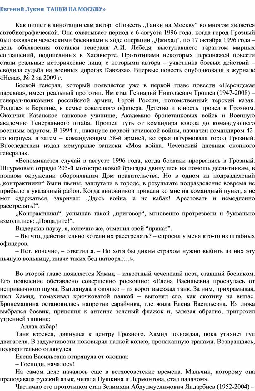 Как пишет в аннотации сам автор: «Повесть „Танки на Москву“ во многом является автобиографической. Она охватывает период с 6 августа 1996 года, когда город Грозный был захвачен чеченскими боевиками в ходе операции „Джихад“, по 17 октября 1996 года – день объявления отставки генерала А.И. Лебедя, выступавшего гарантом мирных соглашений, подписанных в Хасавюрте. Прототипами некоторых персонажей повести стали реальные исторические лица, с которыми автора – участника боевых действий – сводила судьба на военных дорогах Кавказа». Впервые повесть опубликовали в журнале «Нева», № 2 за 2009 г.