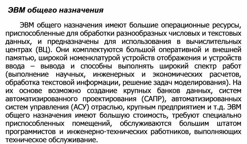 ЭВМ общего назначения имеют большие операционные ресурсы, приспособленные для обработки разнообразных числовых и текстовых данных, и предназначены для использования в вычислительных центрах (ВЦ). Они комплектуются большой оперативной и внешней памятью, широкой номенклатурой устройств отображения и устройств ввода – вывода и способны выполнять широкий спектр работ (выполнение научных, инженерных и экономических расчетов, обработка текстовой информации, решение задач моделирования). На их основе возможно создание крупных банков данных, систем автоматизированного проектирования (САПР), автоматизированных систем управления (АСУ) отраслью, крупным предприятием и т.д. ЭВМ общего назначения имеют большую стоимость, требуют специально приспособленных помещений, обслуживаются большим штатом программистов и инженерно-технических работников, выполняющих техническое обслуживание.