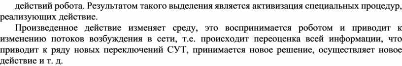 Произведенное действие изменяет среду, это воспринимается роботом и приводит к изменению потоков возбуждения в сети, т.е. происходит переоценка всей информации, что приводит к ряду новых переключений СУТ, принимается новое решение, осуществляет новое действие и т. д.