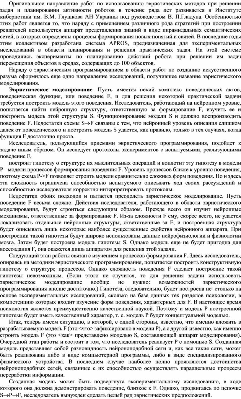 Оригинальное направление работ по использованию эвристических методов при решении задач и планировании активности роботов в течение ряда лет развивается в Институте кибернетики им. В.М. Глушкова АН Украины под руководством В. П.Гладуна. Особенностью этих работ является то, что наряду с применением различного рода стратегий при построении решателей используется аппарат представления знаний в виде пирамидальных семантических сетей, в которых определены процессы формирования новых понятий и связей. В последние годы этим коллективом разработана система APROS, предназначенная для экспериментальных исследований в области планирования и решения практических задач. На этой системе проводились эксперименты по планированию действий робота при решении им задач перемещения объектов в средах, содержащих до 100 объектов.