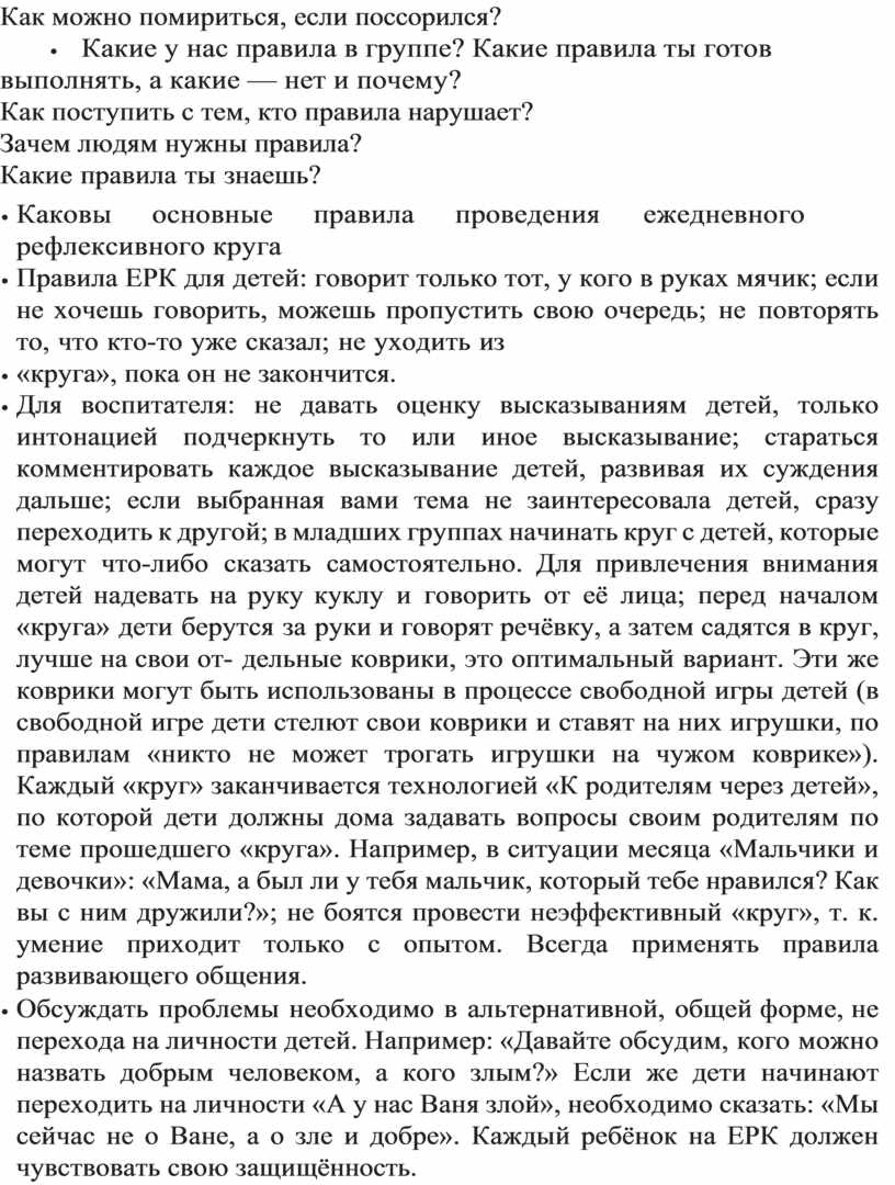 Вопросы, задаваемые во время «Ежедневного рефлексивного круга» (далее — ЕРК), можно поделить на несколько тем. Например: «Чем мы сегодня будем заниматься?», «Почему мы выбираем именно эту тему и проблемы?», «Что интересного произошло у нас в группе вчера?», «Как вы думаете, кого мы можем назвать справедливым? А кого добрым, заботливым?», «По- чему не удаётся соблюдать правила в группе?», «Что делать, если хочется подраться?» и т. д. Например, вопросы по ситуации месяца «Мой дом — детский сад» могут быть следующими: