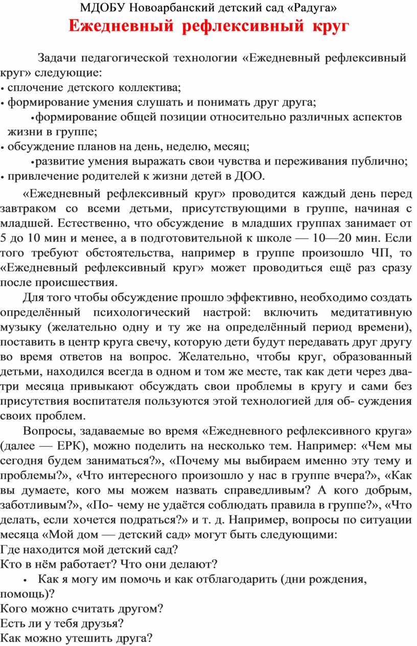 «Ежедневный рефлексивный круг» проводится каждый день перед завтраком со всеми детьми, присутствующими в группе, начиная с младшей. Естественно, что обсуждение в младших группах занимает от 5 до 10 мин и менее, а в подготовительной к школе — 10—20 мин. Если того требуют обстоятельства, например в группе произошло ЧП, то «Ежедневный рефлексивный круг» может проводиться ещё раз сразу после происшествия.