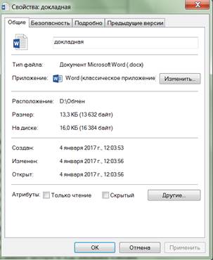 информацию о свойствах файла. При этом на экране появится окно с несколькими вкладками, в котором эти самые свойства и будут отображены. Количество вкладок и их содержимое зависит от самого файла, то есть от имеющихся у него свойств. Количество вкладок зависит также и от типа файловой системы, которая используется на компьютере. Так, при использовании файловой системы NTFS, что и рекомендуется, для каждого файла в его свойствах становится доступной вкладка Безопасность, на которой указывается, кто может иметь доступ к файлу, а кто не может. Если же используется файловая система FAT32, то вы такой возможности лишены, а вкладка Безопасность в окне Свойства отсутствует. Как правило, всегда окно свойств файла содержит две вкладки – Общие и Подробно. При этом с самого начала окно Свойства открывается на вкладке Общие. Вверху этой вкладки указывается имя файла, оно приводится в редактируемом поле, и при желании можно прямо здесь его изменить. В