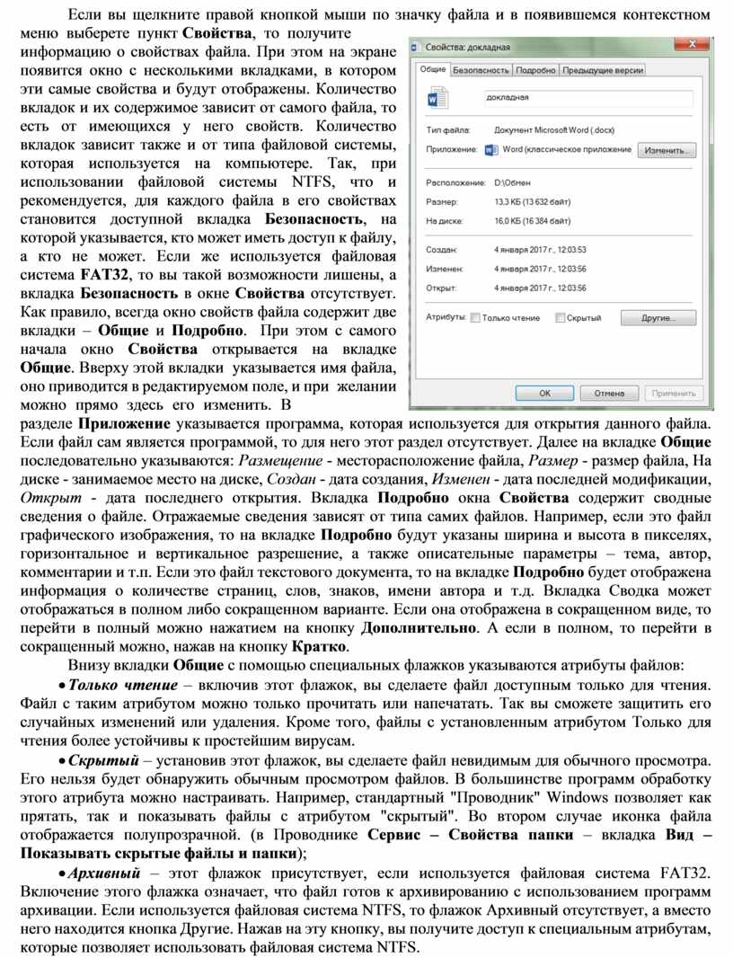 Файл имеет размер, дату и время создания или последнего изменения, что позволяет удобно сортировать файлы и облегчает поиски нужных файлов на диске. Всё это так называемые атрибуты файла.