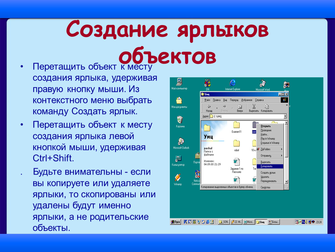 Перетащить объект к месту создания ярлыка, удерживая правую кнопку мыши. Из контекстного меню выбрать команду Создать ярлык.