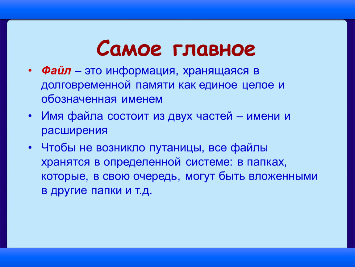 Файл – это информация, хранящаяся в долговременной памяти как единое целое которое имеет имя и расширение