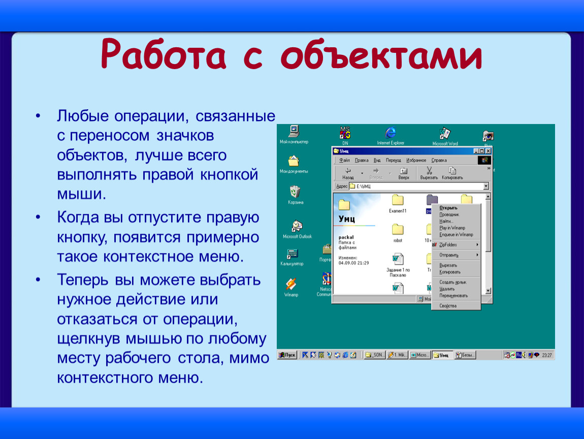 Теперь вы можете выбрать нужное действие или отказаться от операции, щелкнув мышью по любому месту рабочего стола, мимо контекстного меню.