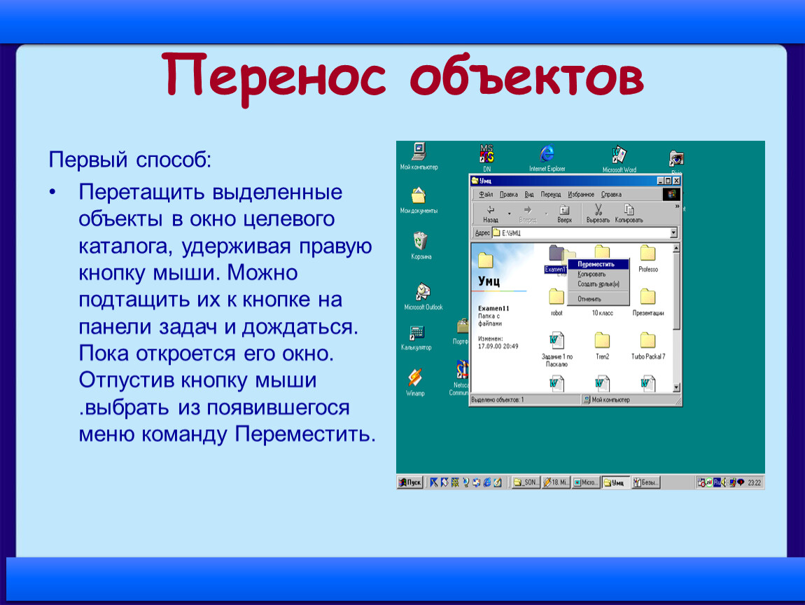 Перетащить выделенные объекты в окно целевого каталога, удерживая правую кнопку мыши. Можно подтащить их к кнопке на панели задач и дождаться. Пока откроется его окно. Отпустив кнопку мыши .выбрать из появившегося меню команду Переместить.