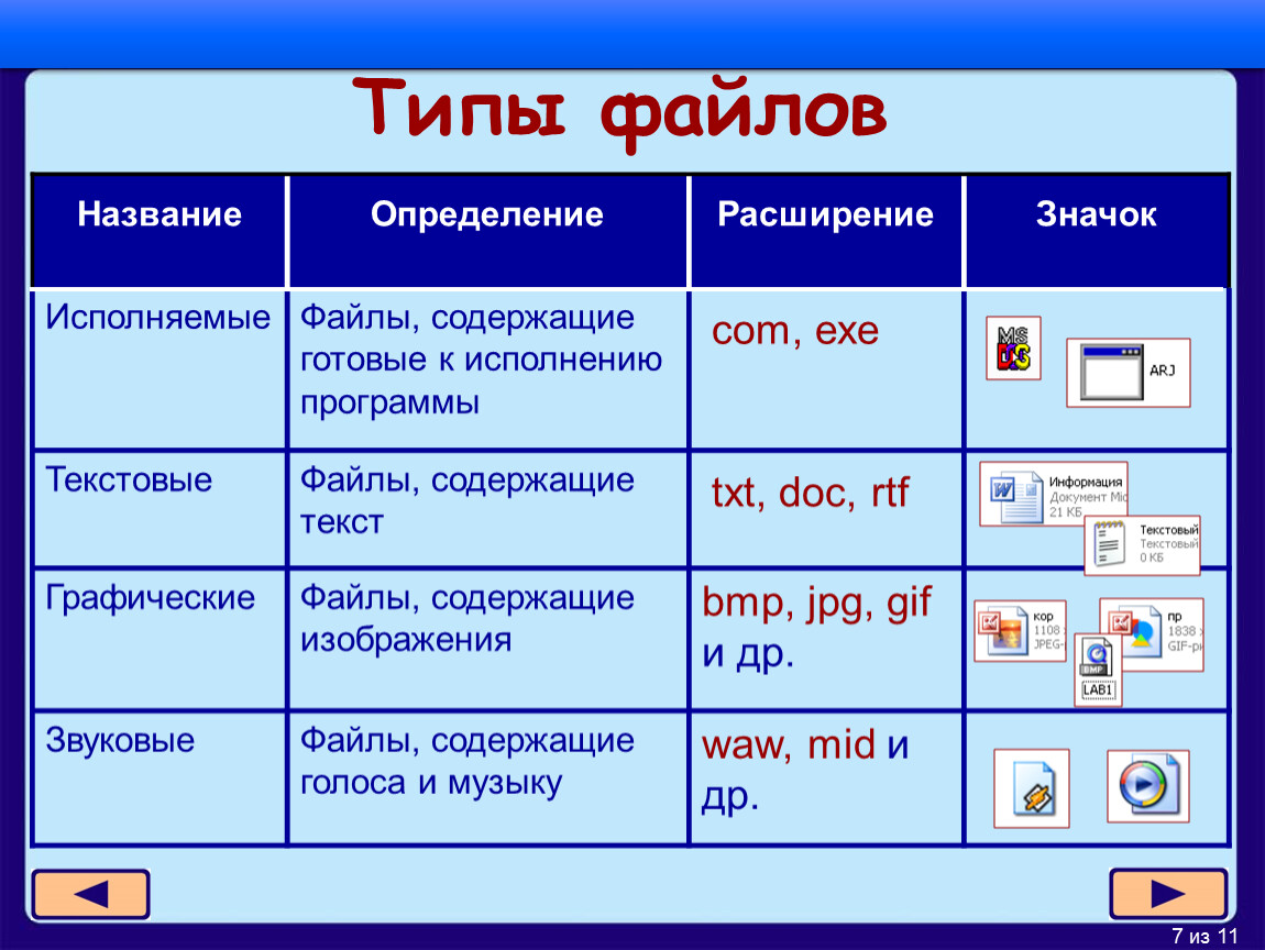 Графические | Файлы, содержащие изображения | bmp, jpg, gif и др. | |