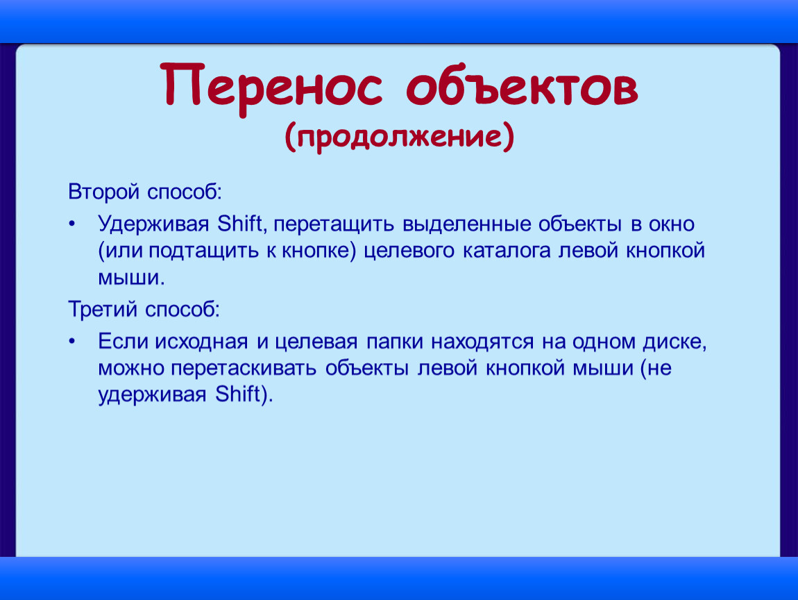 Если исходная и целевая папки находятся на одном диске, можно перетаскивать объекты левой кнопкой мыши (не удерживая Shift).