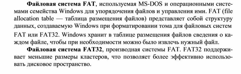 Файловая система FAT, используемая MS-DOS и операционными систе- мами семейства Windows для упорядочения файлов и управления ими. FAT (file allocation table — таблица размещения файлов) представляет собой структуру данных, создаваемую Windows при форматировании тома для файловых систем