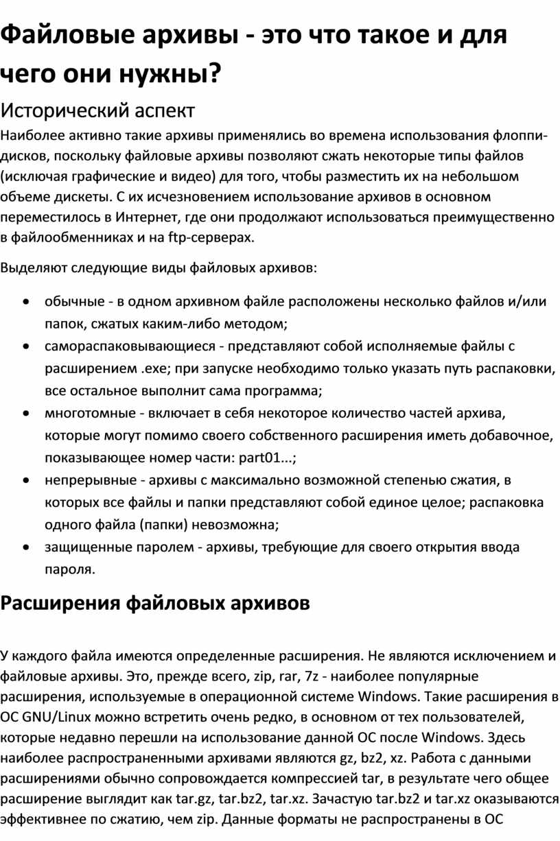 Выделяют следующие виды файловых архивов: