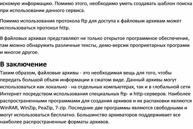 Таким образом, файловые архивы - это необходимая вещь для того, чтобы передать большой объем информации в сжатом виде. Данный архивы могут использоваться как локально - на отдельных компьютерах, так и в глобальной сети Интернет посредством использования специальных ftp- и http-серверов. Наиболее распространенными программами для создания архивов и их распаковки являются WinRAR, WinZip, PeaZip, 7-zip. Последние две программы являются свободными и могут использоваться бесплатно. Большинство архиваторов поддерживает все наиболее распространенные форматы архивов.