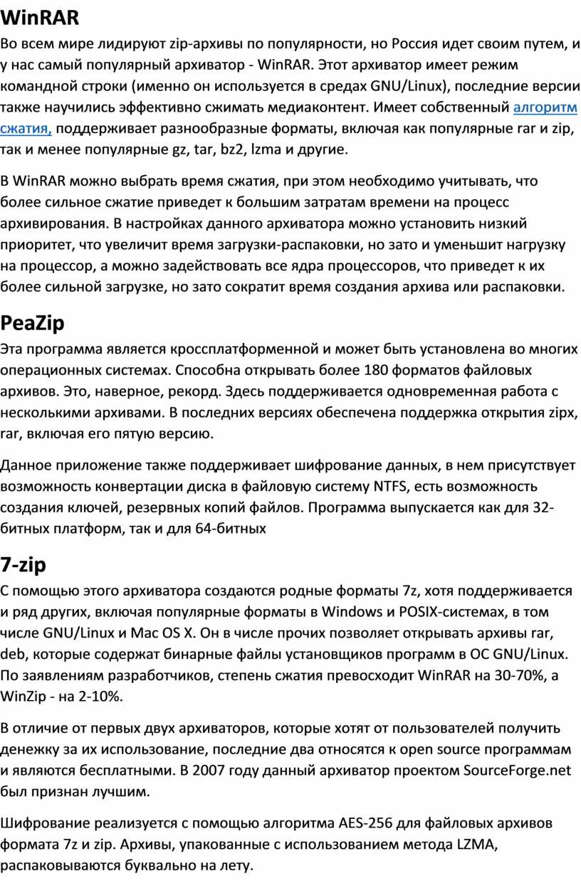 Во всем мире лидируют zip-архивы по популярности, но Россия идет своим путем, и у нас самый популярный архиватор - WinRAR. Этот архиватор имеет режим командной строки (именно он используется в средах GNU/Linux), последние версии также научились эффективно сжимать медиаконтент. Имеет собственный алгоритм сжатия, поддерживает разнообразные форматы, включая как популярные rar и zip, так и менее популярные gz, tar, bz2, lzma и другие.