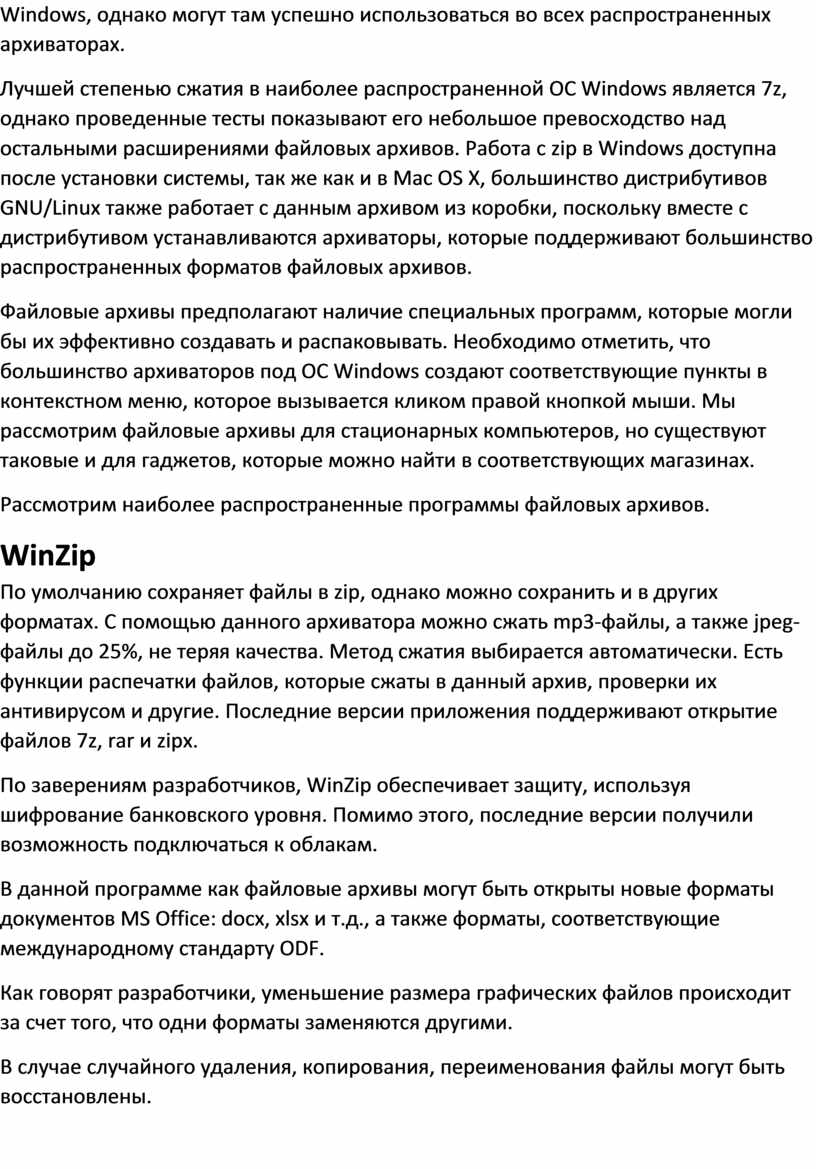 Лучшей степенью сжатия в наиболее распространенной ОС Windows является 7z, однако проведенные тесты показывают его небольшое превосходство над остальными расширениями файловых архивов. Работа с zip в Windows доступна после установки системы, так же как и в Mac OS X, большинство дистрибутивов GNU/Linux также работает c данным архивом из коробки, поскольку вместе с дистрибутивом устанавливаются архиваторы, которые поддерживают большинство распространенных форматов файловых архивов.