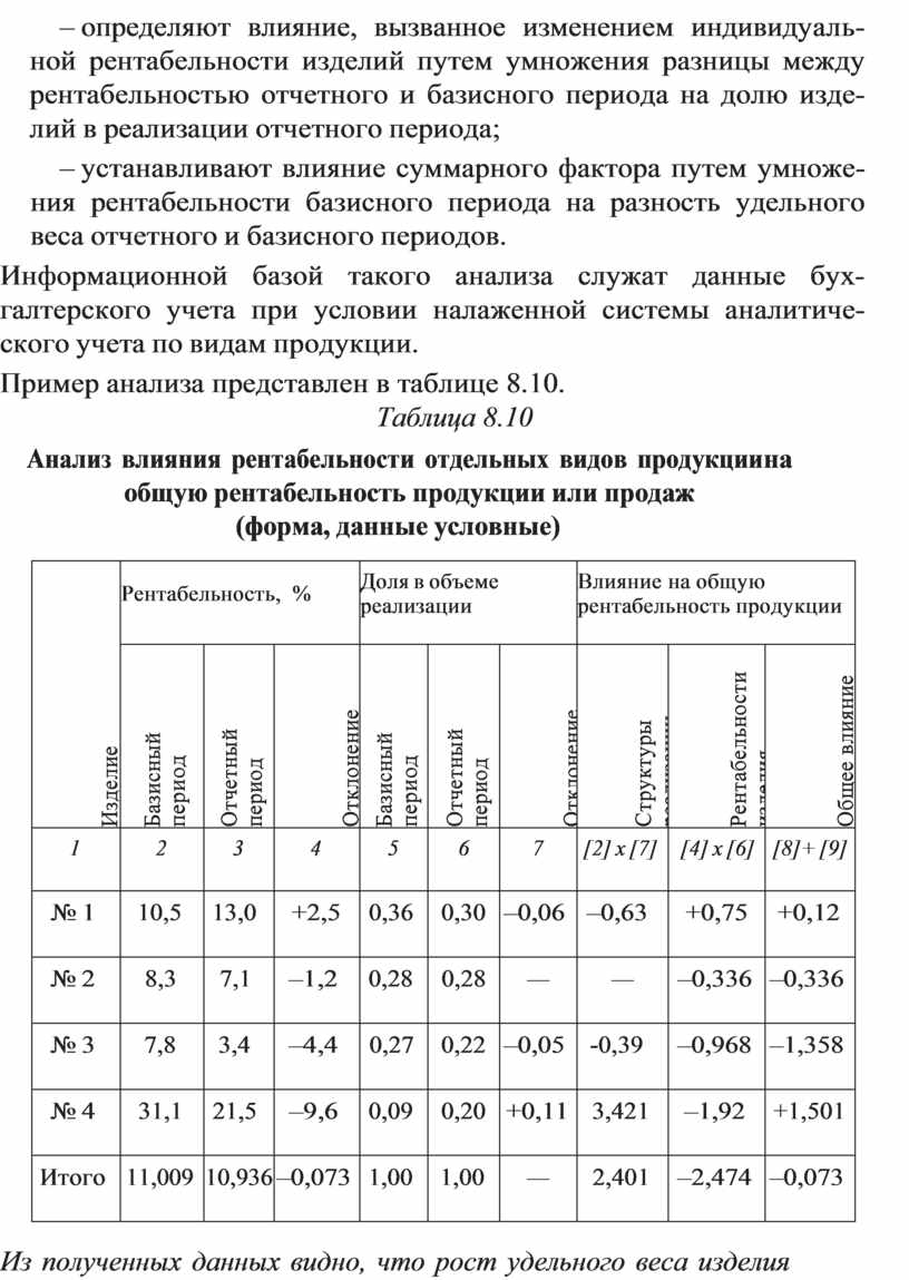 При ограниченной номенклатуре продукции одним из важ- ных направлений анализа является определение влияния рента- бельности отдельных изделий на общую рентабельность продук- ции (продаж), позволяющее оценить рациональность структуры реализации.