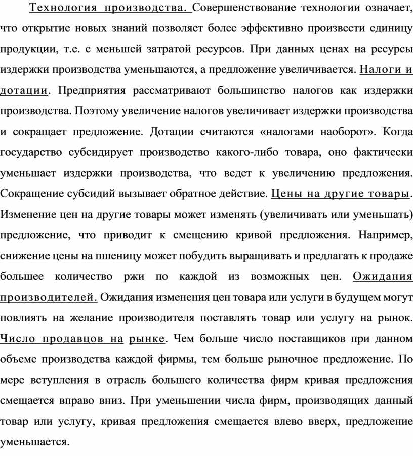 Далее рассмотрим факторы предложения. К неценовым факторам предложения относятся: цены на ресурсы, технология производства, налоги, дотации, цены на другие товары, ожидания производителей, число продавцов на рынке. Цены ресурсов. Существует самая тесная связь между издержками производства и предложением. Кривая предложения фирмы основывается на издержках производства. Снижение ресурсных цен уменьшает издержки и увеличивает предложение, т.е. кривая предложения смещается вправо вниз. Повышение цен на ресурсы ведет к увеличению издержек производства и уменьшению предложения, кривая предложения смещается влево вверх. Технология производства. Совершенствование технологии означает, что открытие новых знаний позволяет более эффективно произвести единицу продукции, т.е. с меньшей затратой ресурсов. При данных ценах на ресурсы издержки производства уменьшаются, а предложение увеличивается. Налоги и дотации. Предприятия рассматривают большинство налогов как издержки производства. Поэтому увеличение налогов увеличивает издержки производства и сокращает предложение. Дотации считаются «налогами наоборот». Когда государство субсидирует производство какого-либо товара, оно фактически уменьшает издержки производства, что ведет к увеличению предложения. Сокращение субсидий вызывает обратное действие. Цены на другие товары. Изменение цен на другие товары может изменять (увеличивать или уменьшать) предложение, что приводит к смещению кривой предложения. Например, снижение цены на пшеницу может побудить выращивать и предлагать к продаже большее количество ржи по каждой из возможных цен. Ожидания производителей. Ожидания изменения цен товара или услуги в будущем могут повлиять на желание производителя поставлять товар или услугу на рынок. Число продавцов на рынке. Чем больше число поставщиков при данном объеме производства каждой фирмы, тем больше рыночное предложение. По мере вступления в отрасль большего количества фирм кривая предложения смещается вправо вниз. При уменьшении числа фирм, производящих данный товар или услугу, кривая предложения смещается влево вверх, предложение уменьшается.