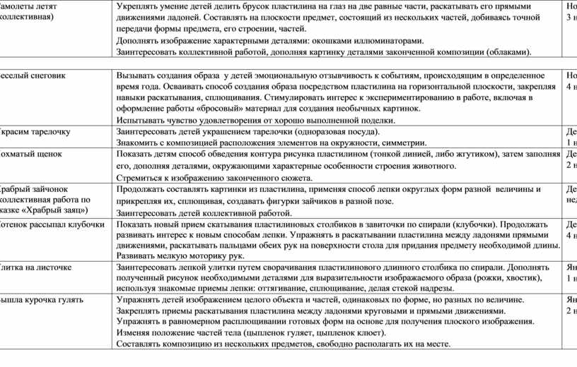 Вызывать создания образа у детей эмоциональную отзывчивость к событиям, происходящим в определенное время года. Осваивать способ создания образа посредством пластилина на горизонтальной плоскости, закрепляя навыки раскатывания, сплющивания. Стимулировать интерес к экспериментированию в работе, включая в оформление работы «бросовый» материал для создания необычных картинок. Испытывать чувство удовлетворения от хорошо выполненной поделки. |