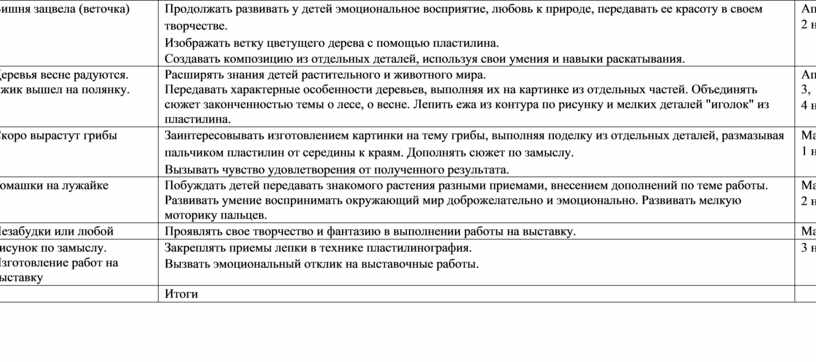 Продолжать развивать у детей эмоциональное восприятие, любовь к природе, передавать ее красоту в своем творчестве. Изображать ветку цветущего дерева с помощью пластилина. Создавать композицию из отдельных деталей, используя свои умения и навыки раскатывания. |