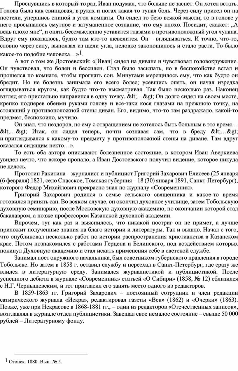 Прототип Ракитина – журналист и публицист Григорий Захарович Елисеев (25 января (6 февраля) 1821, село Спасское, Томская губерния – 18 (30) января 1891, Санкт-Петербург), которого Федор Михайлович прекрасно знал по журналу «Современник».