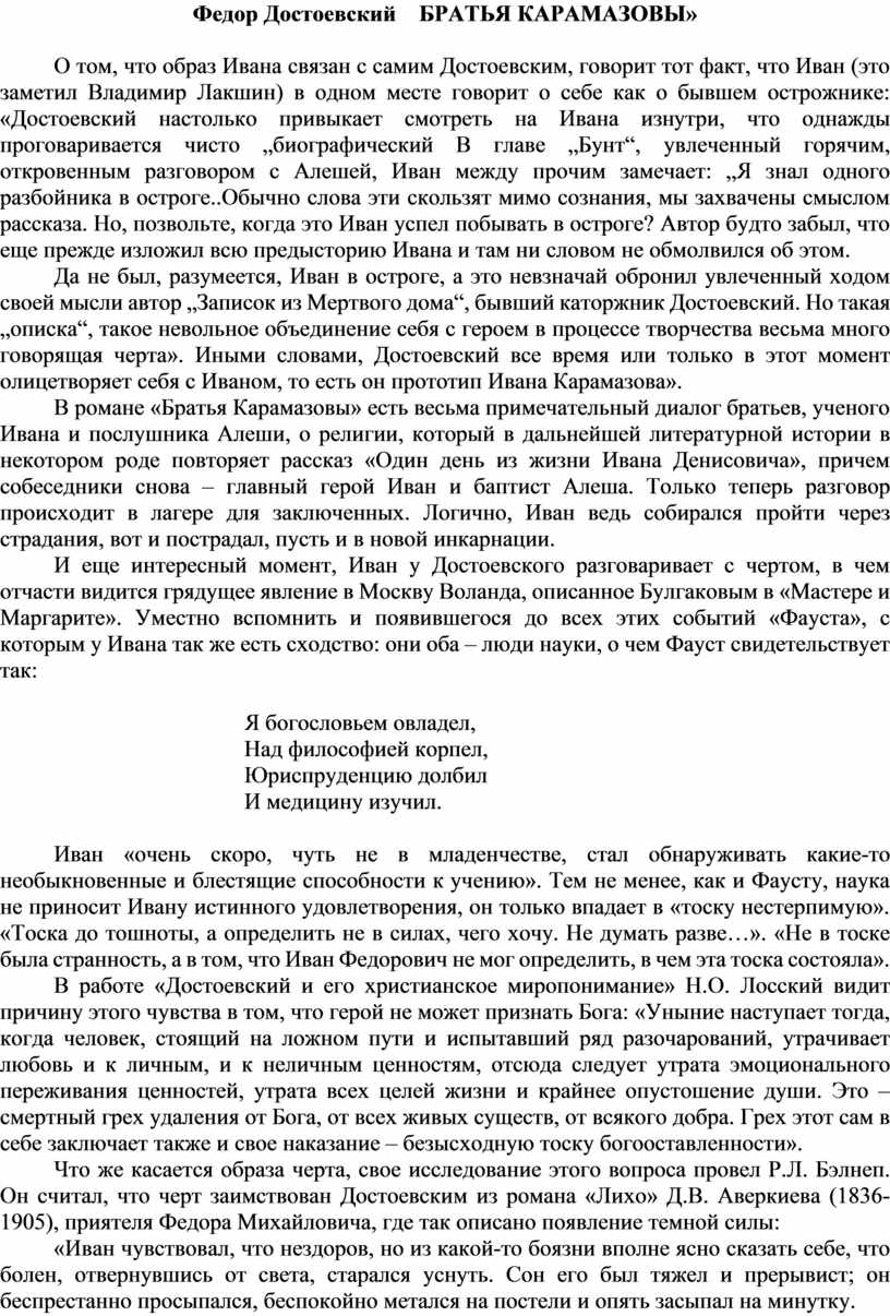 В романе «Братья Карамазовы» есть весьма примечательный диалог братьев, ученого Ивана и послушника Алеши, о религии, который в дальнейшей литературной истории в некотором роде повторяет рассказ «Один день из жизни Ивана Денисовича», причем собеседники снова – главный герой Иван и баптист Алеша. Только теперь разговор происходит в лагере для заключенных. Логично, Иван ведь собирался пройти через страдания, вот и пострадал, пусть и в новой инкарнации.