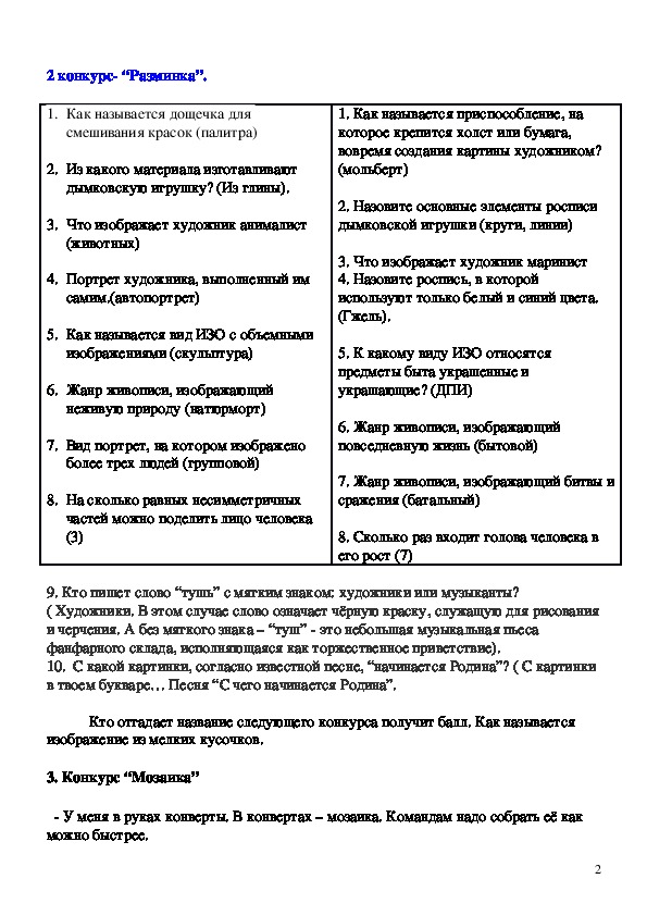 команды, песня, девиз, эмблема – всё должно быть связано с ИЗО или музыкой).2 конкурс “Разминка”.