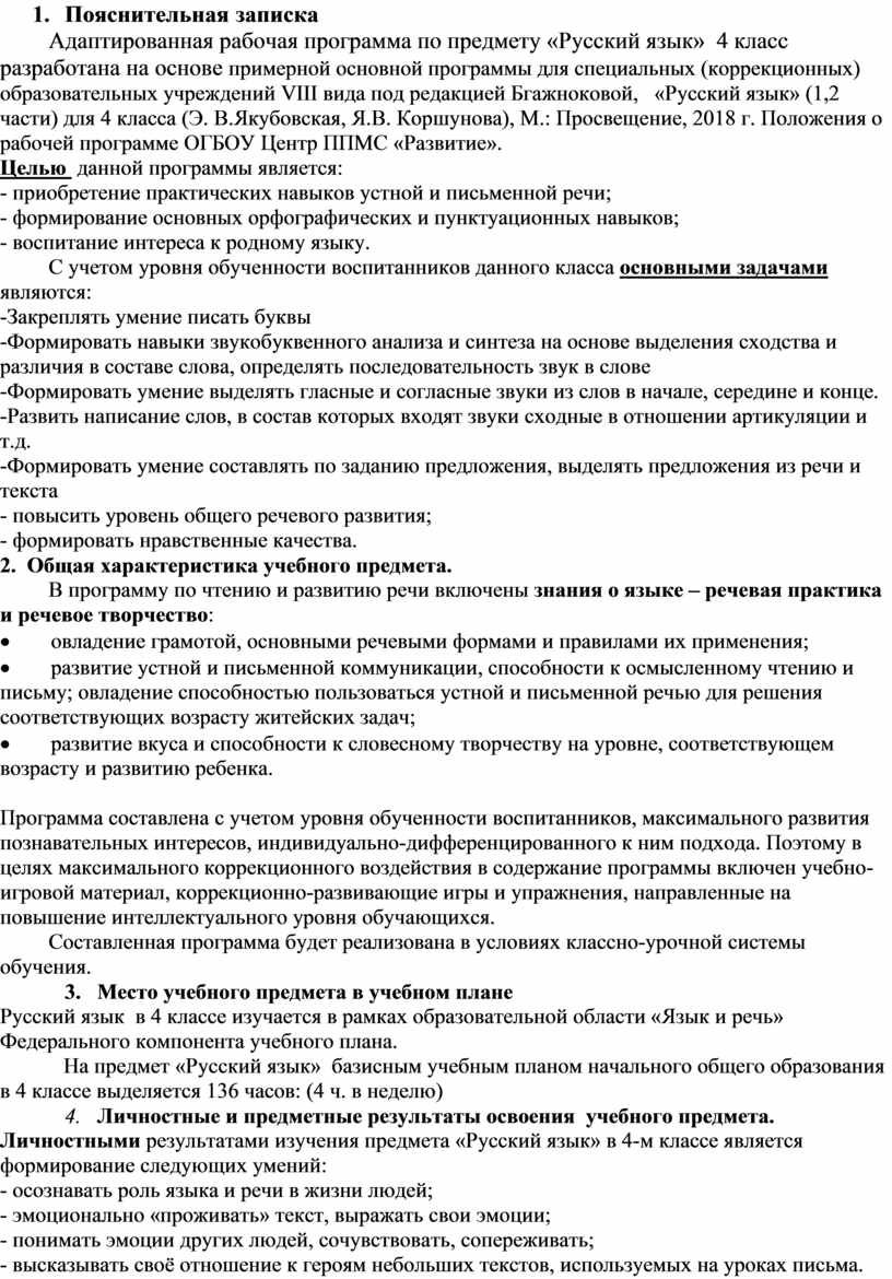 Адаптированная рабочая программа по предмету «Русский язык» 4 класс разработана на основе примерной основной программы для специальных (коррекционных) образовательных учреждений VIII вида под редакцией Бгажноковой, «Русский язык» (1,2 части) для 4 класса (Э. В.Якубовская, Я.В. Коршунова), М.: Просвещение, 2018 г. Положения о рабочей программе ОГБОУ Центр ППМС «Развитие».
