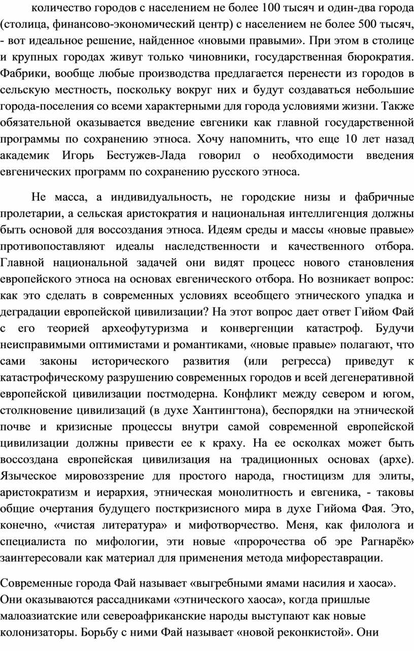 Не масса, а индивидуальность, не городские низы и фабричные пролетарии, а сельская аристократия и национальная интеллигенция должны быть основой для воссоздания этноса. Идеям среды и массы «новые правые» противопоставляют идеалы наследственности и качественного отбора. Главной национальной задачей они видят процесс нового становления европейского этноса на основах евгенического отбора. Но возникает вопрос: как это сделать в современных условиях всеобщего этнического упадка и деградации европейской цивилизации? На этот вопрос дает ответ Гийом Фай с его теорией археофутуризма и конвергенции катастроф. Будучи неисправимыми оптимистами и романтиками, «новые правые» полагают, что сами законы исторического развития (или регресса) приведут к катастрофическому разрушению современных городов и всей дегенеративной европейской цивилизации постмодерна. Конфликт между севером и югом, столкновение цивилизаций (в духе Хантингтона), беспорядки на этнической почве и кризисные процессы внутри самой современной европейской цивилизации должны привести ее к краху. На ее осколках может быть воссоздана европейская цивилизация на традиционных основах (архе). Языческое мировоззрение для простого народа, гностицизм для элиты, аристократизм и иерархия, этническая монолитность и евгеника, - таковы общие очертания будущего посткризисного мира в духе Гийома Фая. Это, конечно, «чистая литература» и мифотворчество. Меня, как филолога и специалиста по мифологии, эти новые «пророчества об эре Рагнарёк» заинтересовали как материал для применения метода мифореставрации.