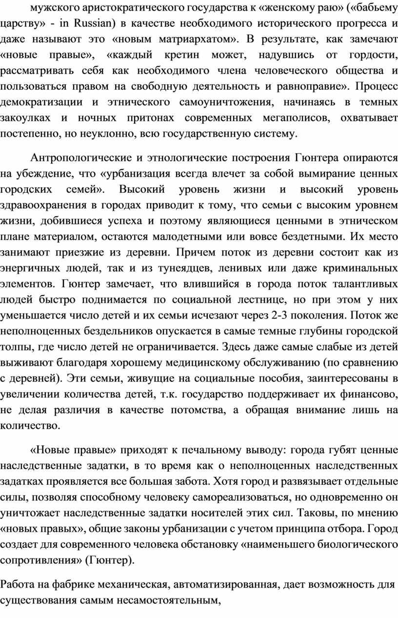 «Новые правые» приходят к печальному выводу: города губят ценные наследственные задатки, в то время как о неполноценных наследственных задатках проявляется все большая забота. Хотя город и развязывает отдельные силы, позволяя способному человеку самореализоваться, но одновременно он уничтожает наследственные задатки носителей этих сил. Таковы, по мнению «новых правых», общие законы урбанизации с учетом принципа отбора. Город создает для современного человека обстановку «наименьшего биологического сопротивления» (Гюнтер).