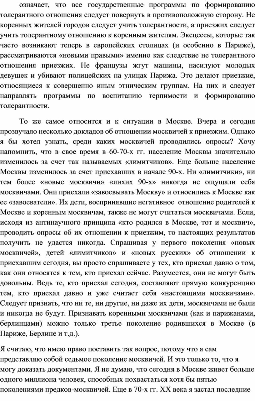 Я считаю, что имею право поставить так вопрос, потому что я сам представляю собой седьмое поколение москвичей. И это только то, что я могу доказать документами. Я не думаю, что сегодня в Москве живет больше одного миллиона человек, способных похвастаться хотя бы пятью поколениями предков-москвичей. Еще в 70-х гг. ХХ века я застал последние осколки настоящей дворянско-купеческой Москвы. Я знаю, как выглядела, о чем и как говорила, как вела себя купеческая и дворянская Москва, я видел остатки их быта. Я знаю, как жила дореволюционная творческая писательская богема, поскольку это все – моя семья и мои предки. Так вот, для настоящих, «генетических» москвичей вопрос о том, как они относятся к приезжим, прозвучал бы как абсолютная дикость и проявление дурного воспитания. Настоящие, «генетические» москвичи всегда относились к Москве как к особому сакральному и трансформирующему пространству. Москва – это мать. Она всех примет, всех накормит, всем найдет место, всех устроит и всех переварит. Но только с одним условием: приезжие также должны относиться к Москве как к своей матери и все же понимать, что они не могут считаться настоящими москвичами, пока не докажут свое право на это почетное звание. Таково подлинное «старомосковское» отношение к приезжим. Это «старомосковское» миросозерцание было в корне подорвано «лимитным» потоком 60-х и бандитским набегом 90-х. Оно может быть восстановлено, но не за счет призывов к москвичам быть толерантными (москвичи всегда отличались толерантностью), а только за счет формирования у приезжих и их потомков особого «московского» мироощущения. Считайте эти слова моим предложением к итоговому документу конгресса.