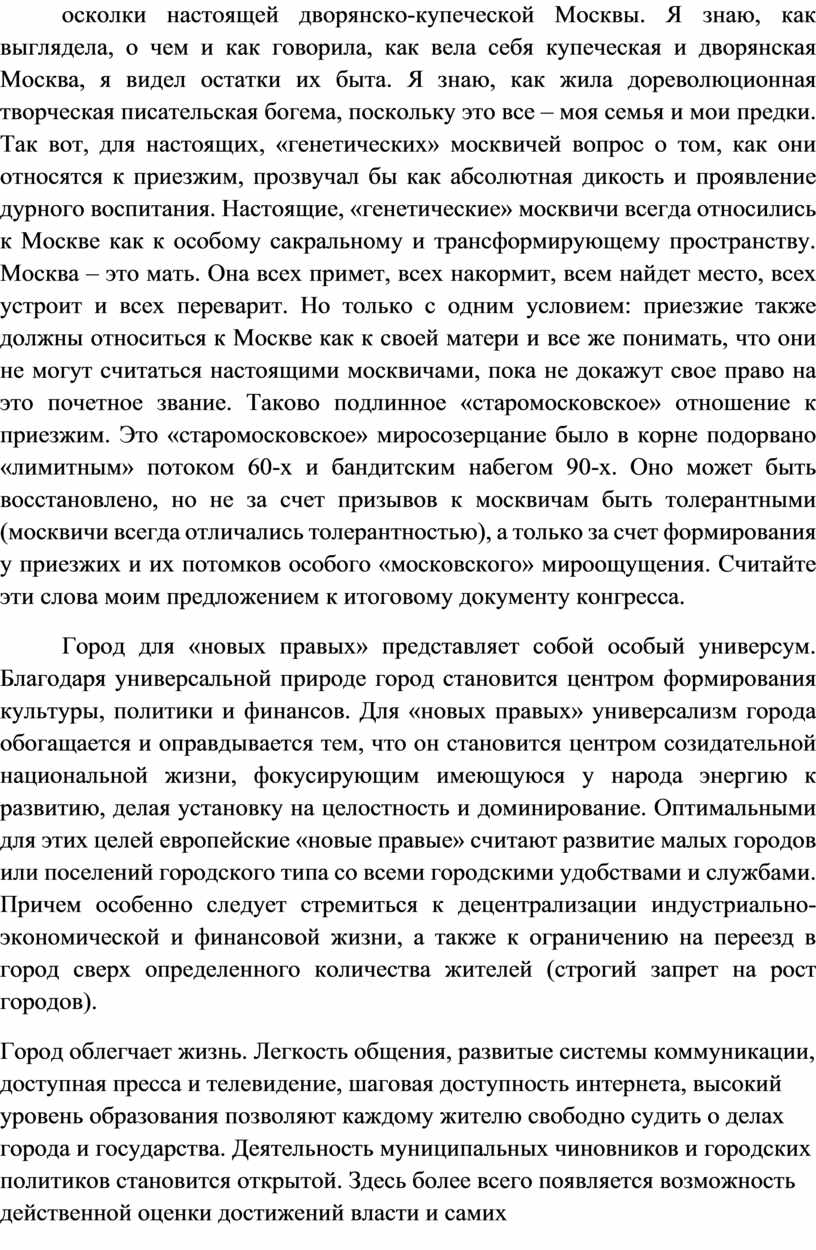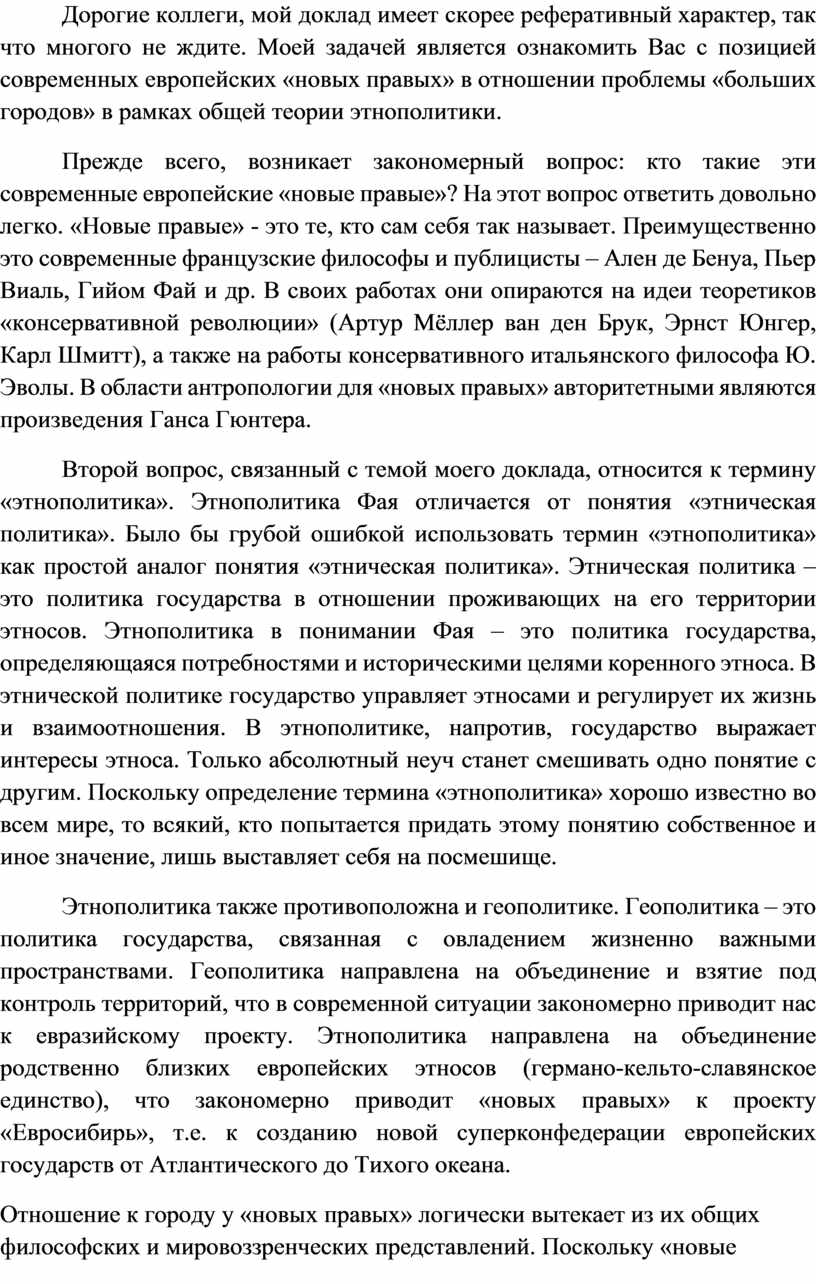 Дорогие коллеги, мой доклад имеет скорее реферативный характер, так что многого не ждите. Моей задачей является ознакомить Вас с позицией современных европейских «новых правых» в отношении проблемы «больших городов» в рамках общей теории этнополитики.