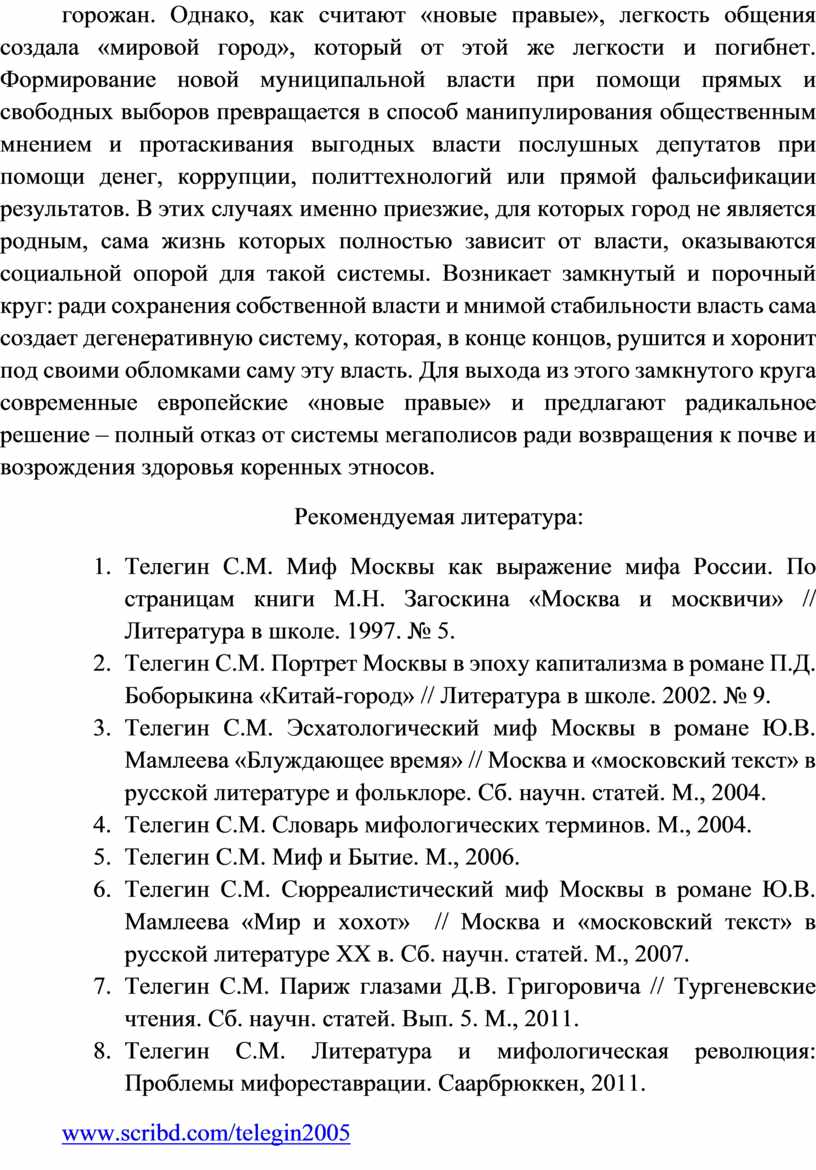 1. Телегин С.М. Миф Москвы как выражение мифа России. По страницам книги М.Н. Загоскина «Москва и москвичи» // Литература в школе. 1997. № 5.