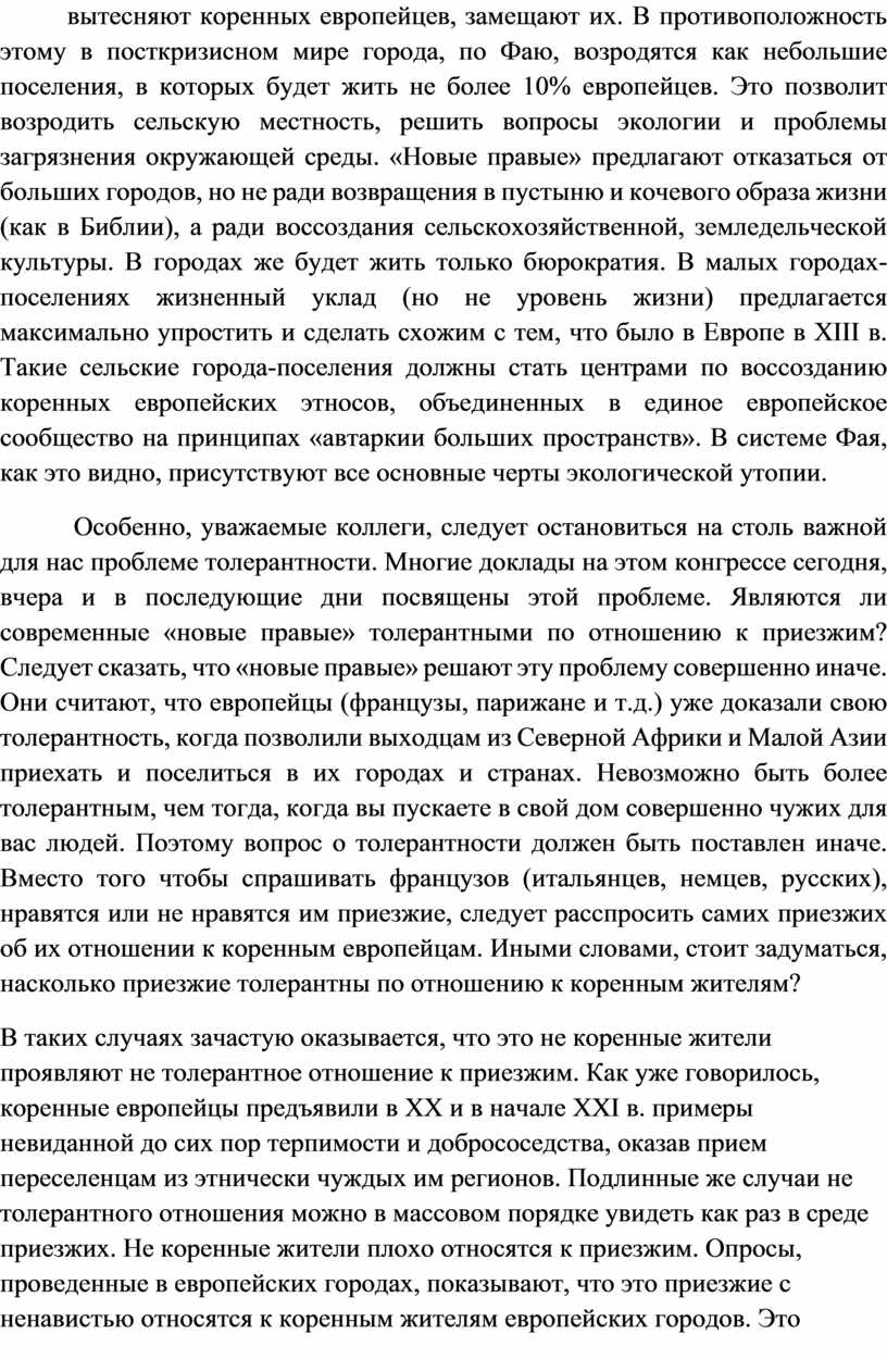 Особенно, уважаемые коллеги, следует остановиться на столь важной для нас проблеме толерантности. Многие доклады на этом конгрессе сегодня, вчера и в последующие дни посвящены этой проблеме. Являются ли современные «новые правые» толерантными по отношению к приезжим? Следует сказать, что «новые правые» решают эту проблему совершенно иначе. Они считают, что европейцы (французы, парижане и т.д.) уже доказали свою толерантность, когда позволили выходцам из Северной Африки и Малой Азии приехать и поселиться в их городах и странах. Невозможно быть более толерантным, чем тогда, когда вы пускаете в свой дом совершенно чужих для вас людей. Поэтому вопрос о толерантности должен быть поставлен иначе. Вместо того чтобы спрашивать французов (итальянцев, немцев, русских), нравятся или не нравятся им приезжие, следует расспросить самих приезжих об их отношении к коренным европейцам. Иными словами, стоит задуматься, насколько приезжие толерантны по отношению к коренным жителям?