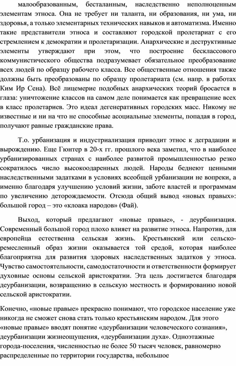 Т.о. урбанизация и индустриализация приводит этнос к деградации и вырождению. Еще Гюнтер в 20-х гг. прошлого века заметил, что в наиболее урбанизированных странах с наиболее развитой промышленностью резко сократилось число высокоодаренных людей. Народы беднеют ценными наследственными задатками в условиях всеобщей урбанизации не вопреки, а именно благодаря улучшению условий жизни, заботе властей и программам по увеличению деторождаемости. Отсюда общий вывод «новых правых»: большой город – это «клоака народов» (Фай).