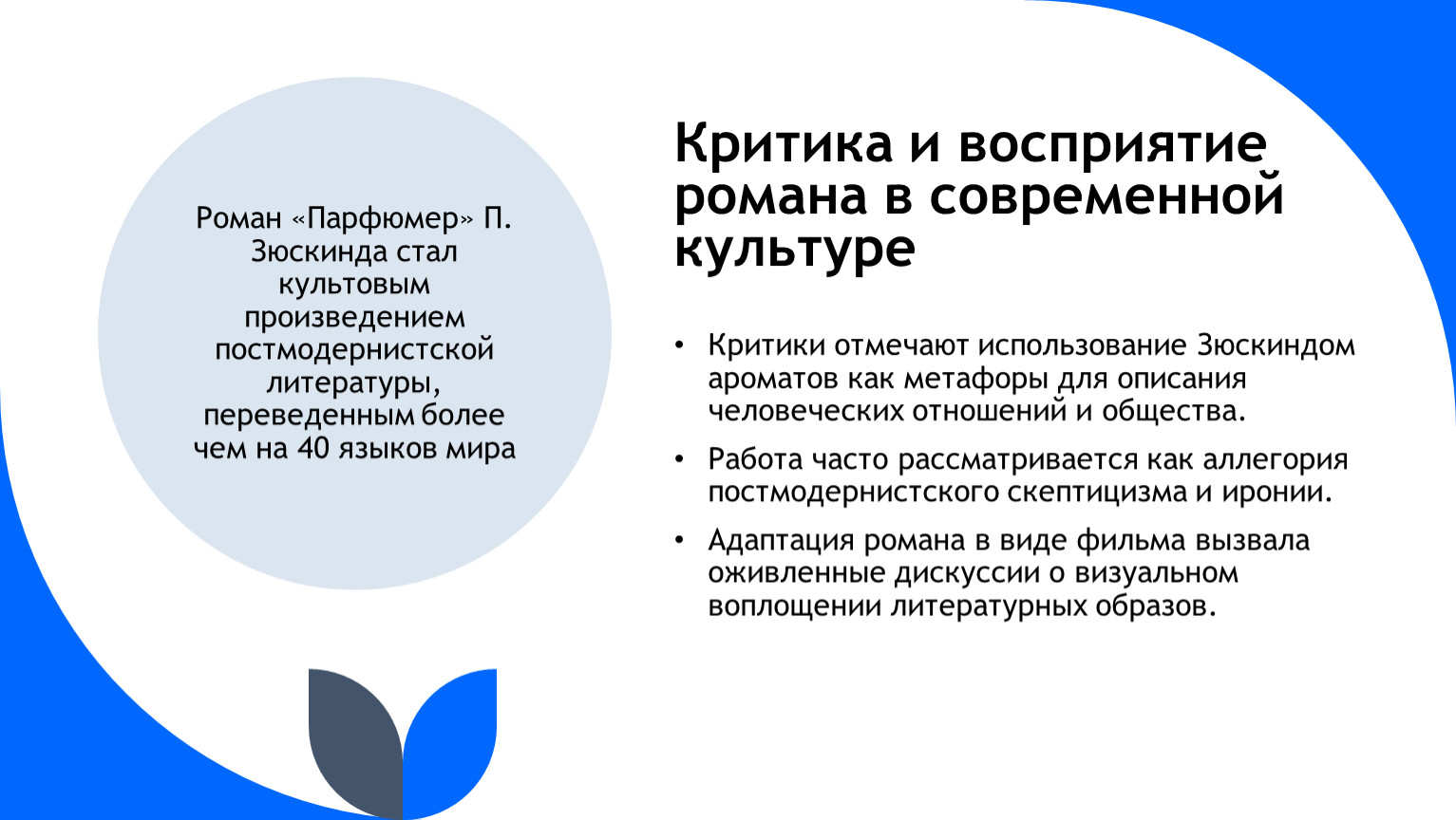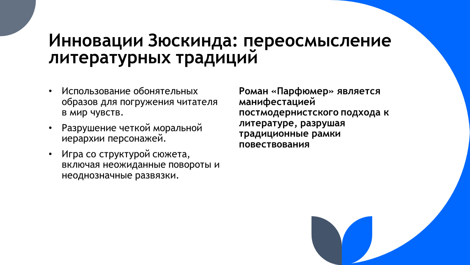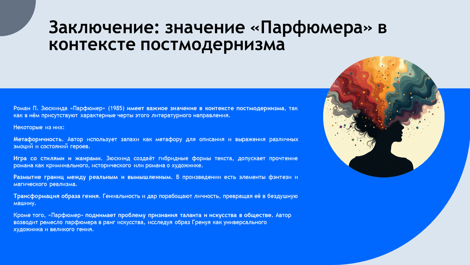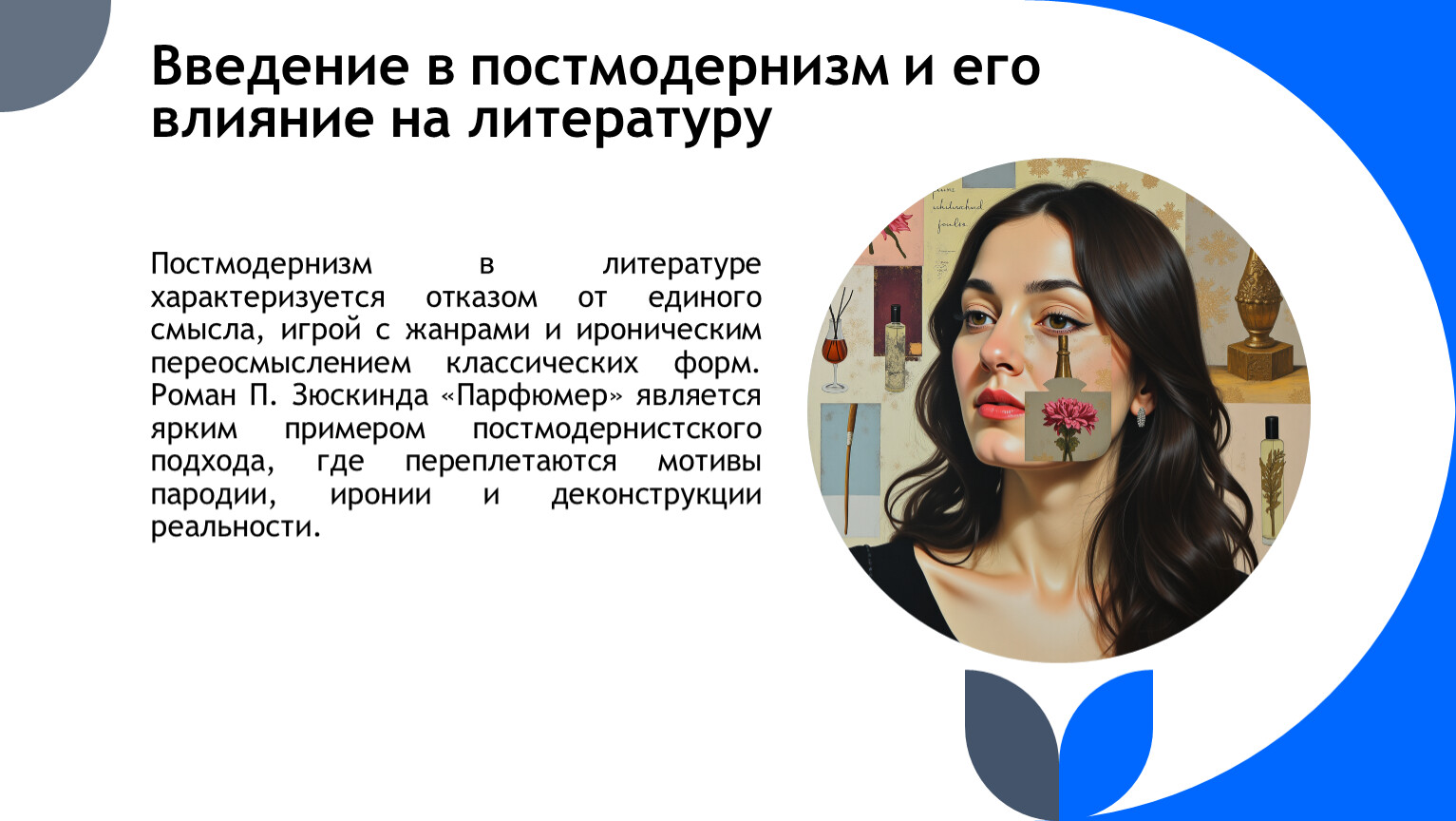 Постмодернизм в литературе характеризуется отказом от единого смысла, игрой с жанрами и ироническим переосмыслением классических форм. Роман П. Зюскинда «Парфюмер» является ярким примером постмодернистского подхода, где переплетаются мотивы пародии, иронии и деконструкции реальности.