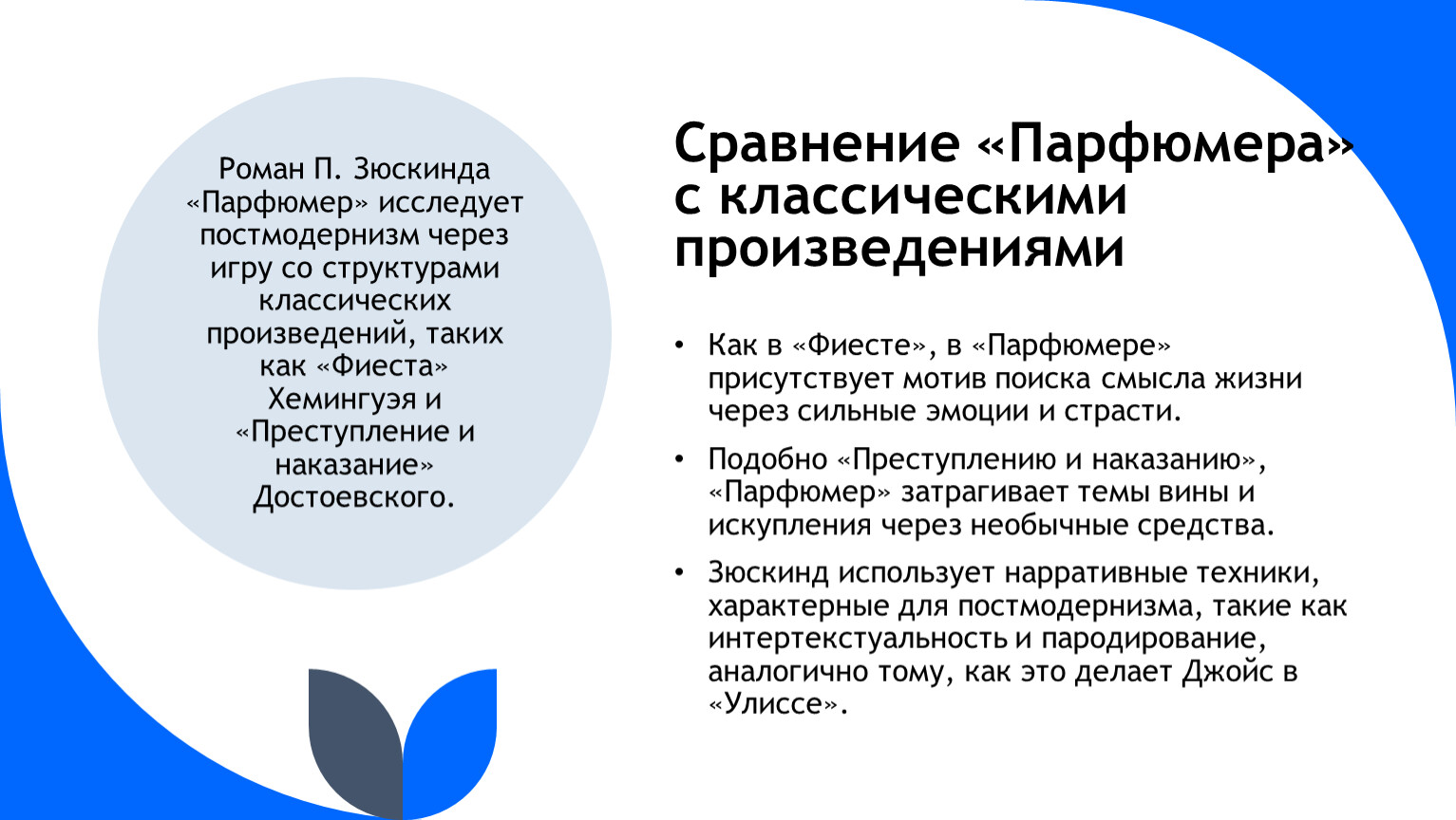 Роман П. Зюскинда «Парфюмер» исследует постмодернизм через игру со структурами классических произведений, таких как «Фиеста» Хемингуэя и «Преступление и наказание» Достоевского.