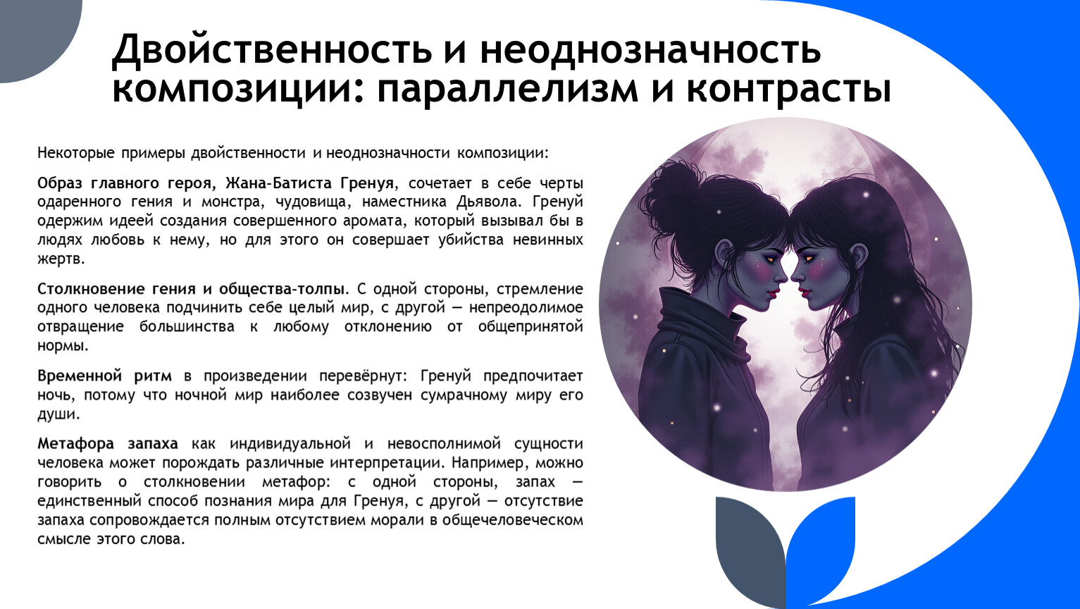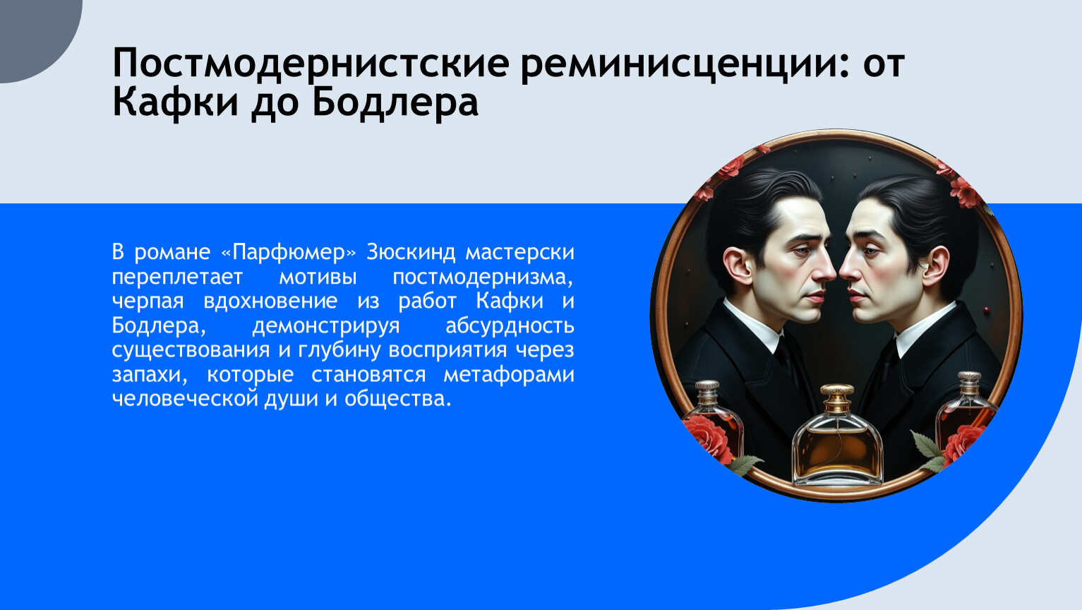 В романе «Парфюмер» Зюскинд мастерски переплетает мотивы постмодернизма, черпая вдохновение из работ Кафки и Бодлера, демонстрируя абсурдность существования и глубину восприятия через запахи, которые становятся метафорами человеческой души и общества.