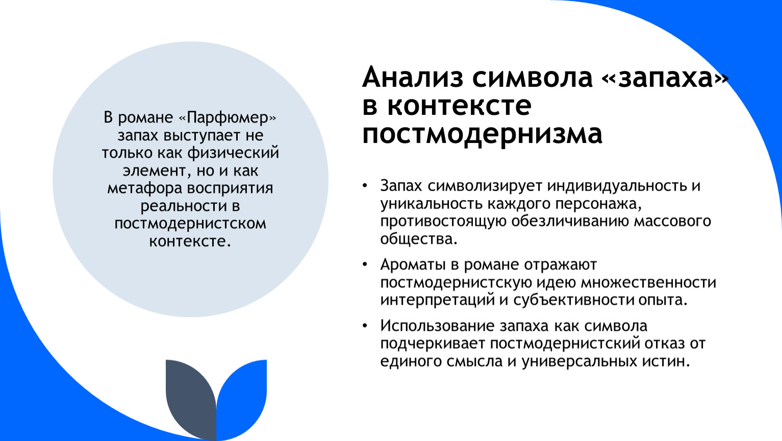 Использование запаха как символа подчеркивает постмодернистский отказ от единого смысла и универсальных истин.