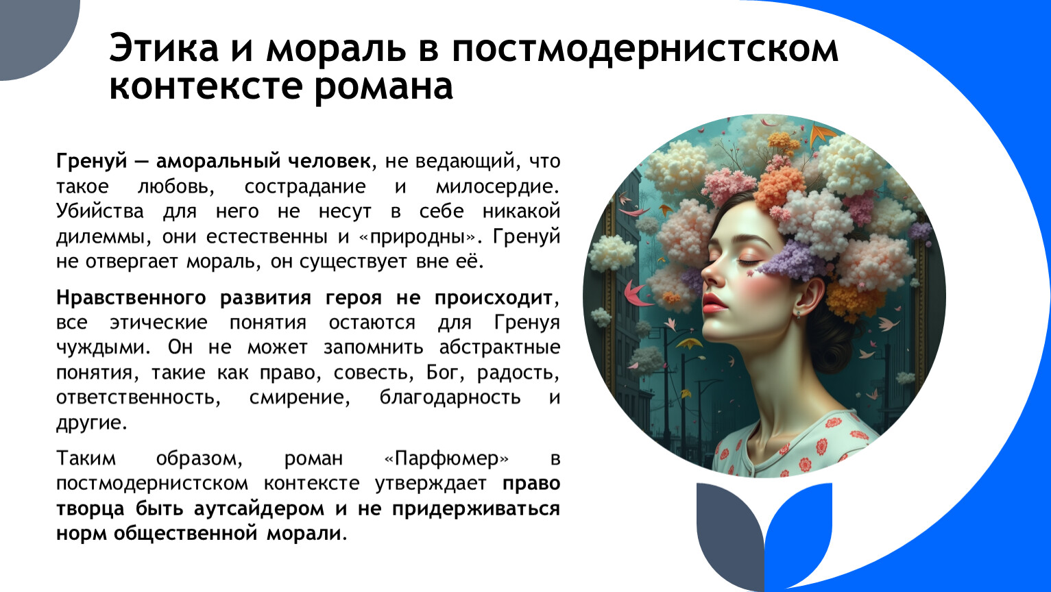 Таким образом, роман «Парфюмер» в постмодернистском контексте утверждает право творца быть аутсайдером и не придерживаться норм общественной морали.