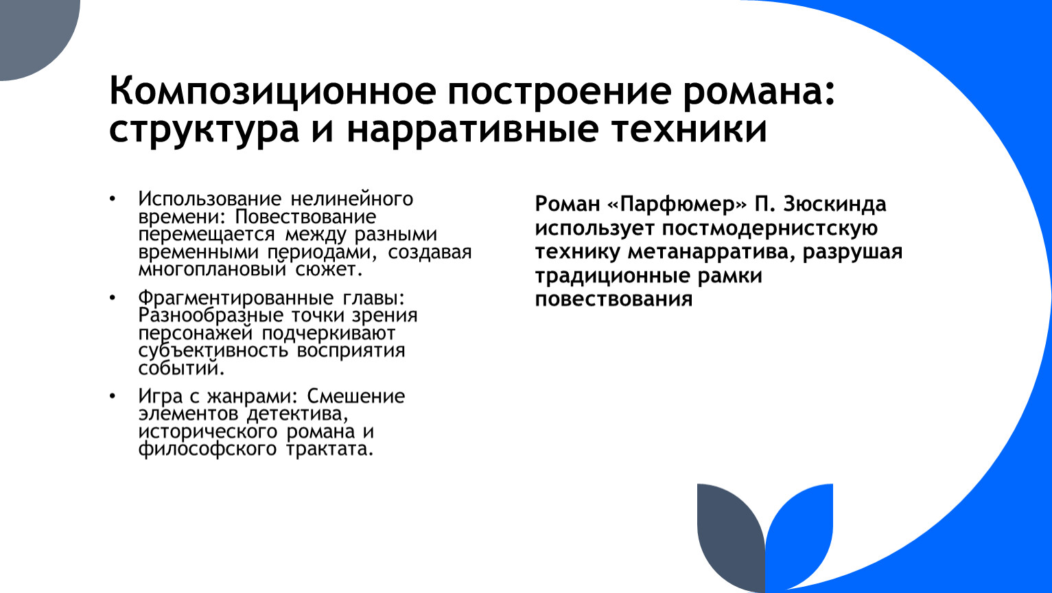 Роман «Парфюмер» П. Зюскинда использует постмодернистскую технику метанарратива, разрушая традиционные рамки повествования